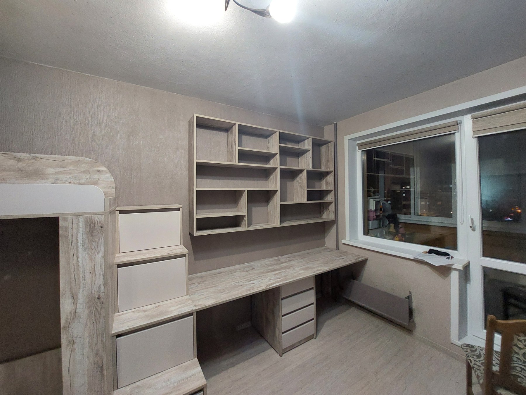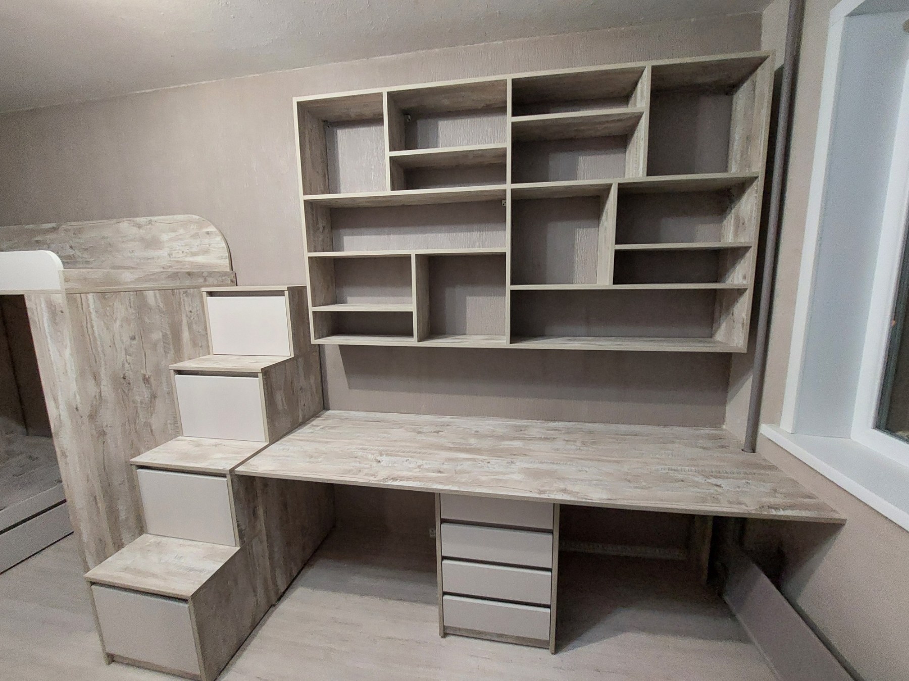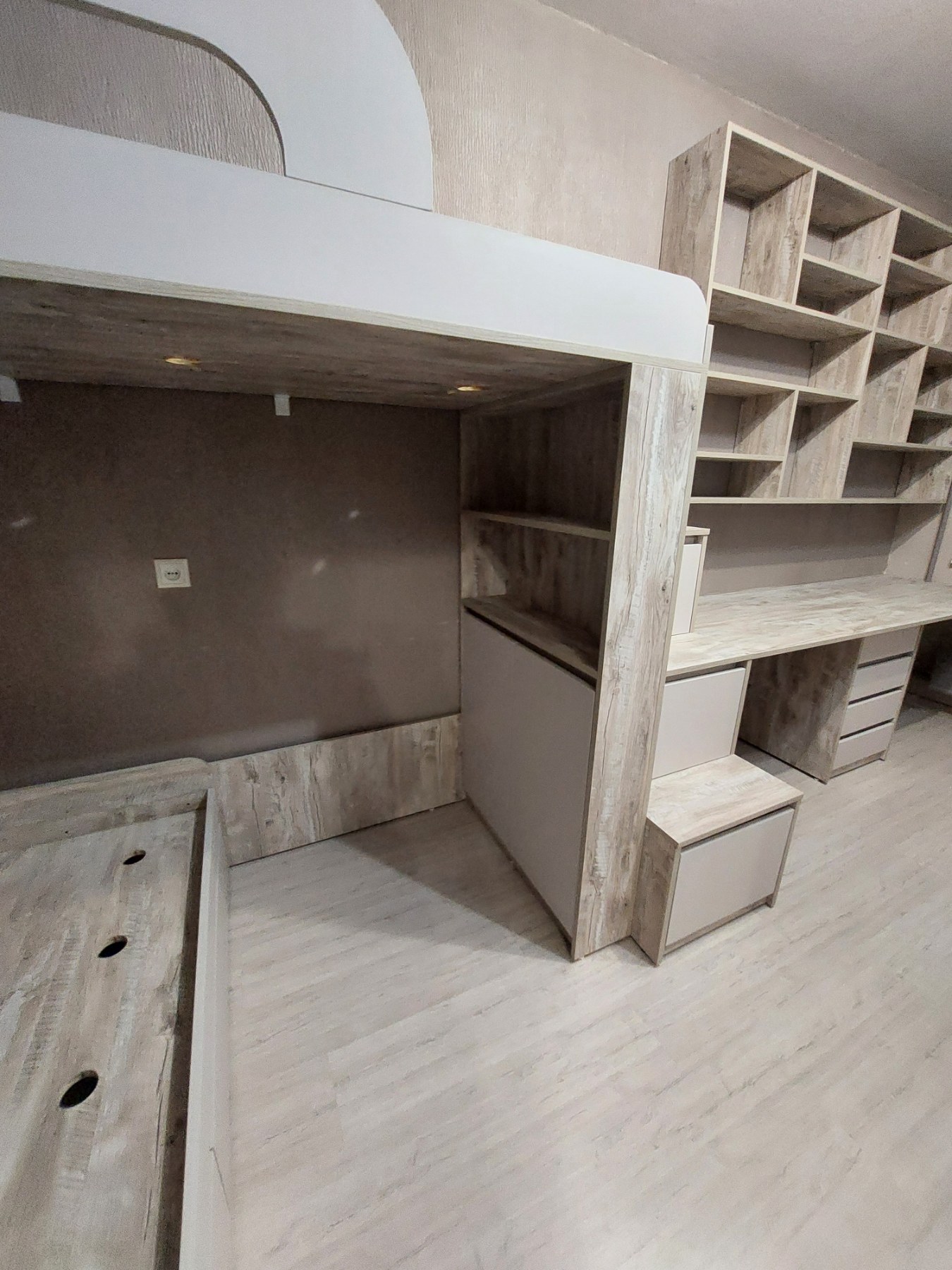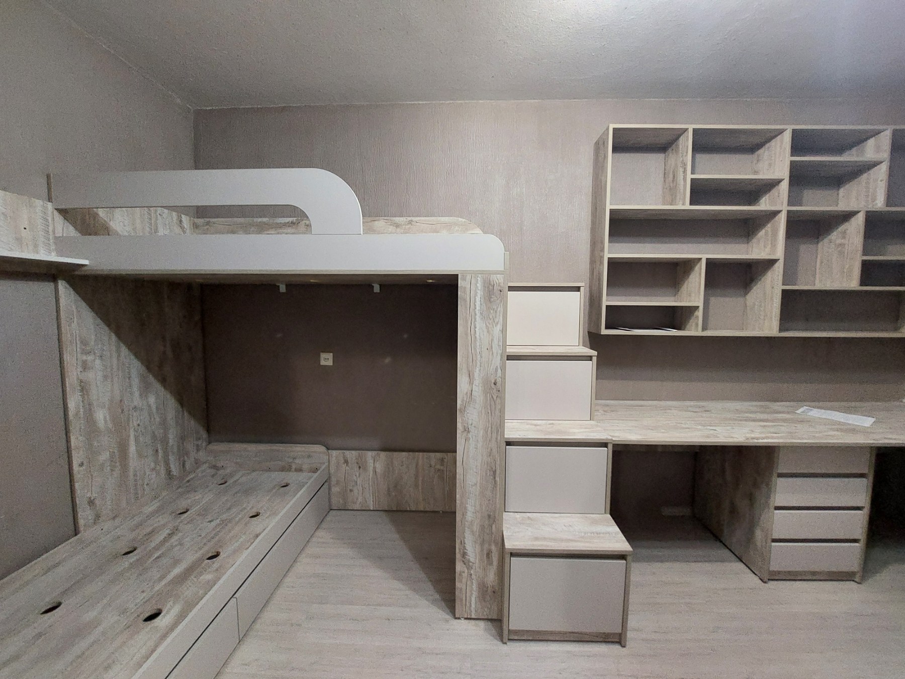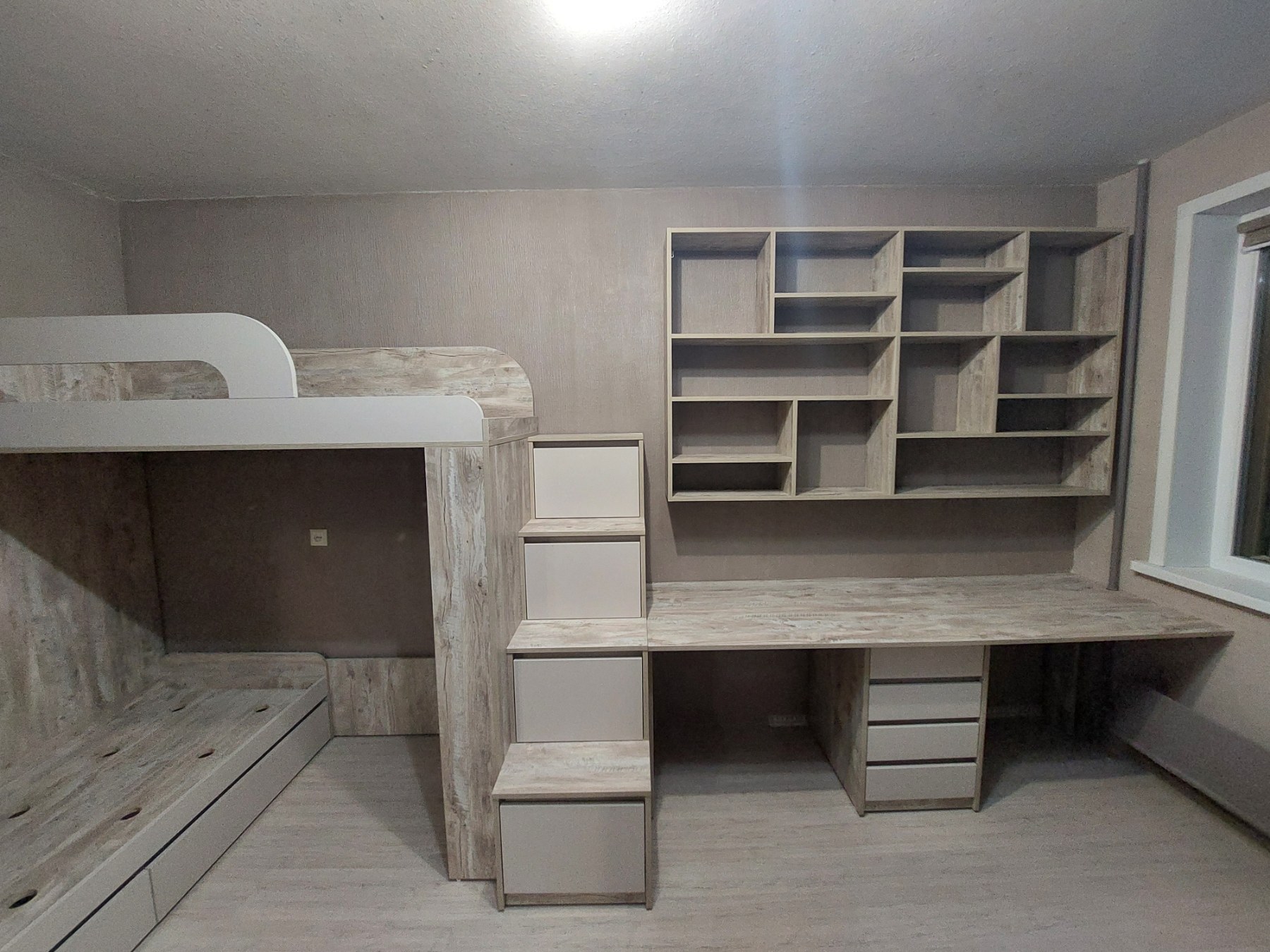 Большая серая детская комната с двухярустной кроватью и ступенями