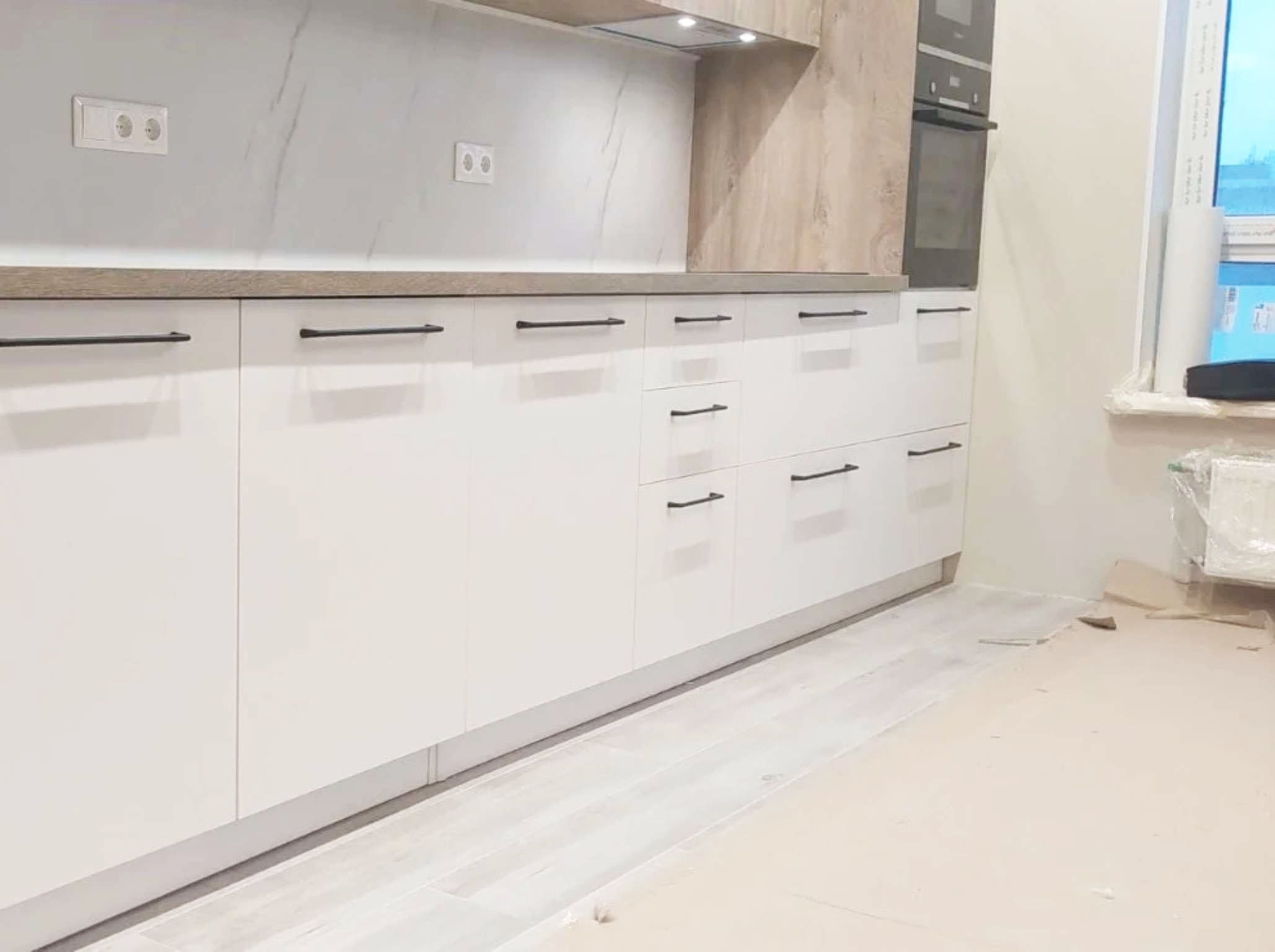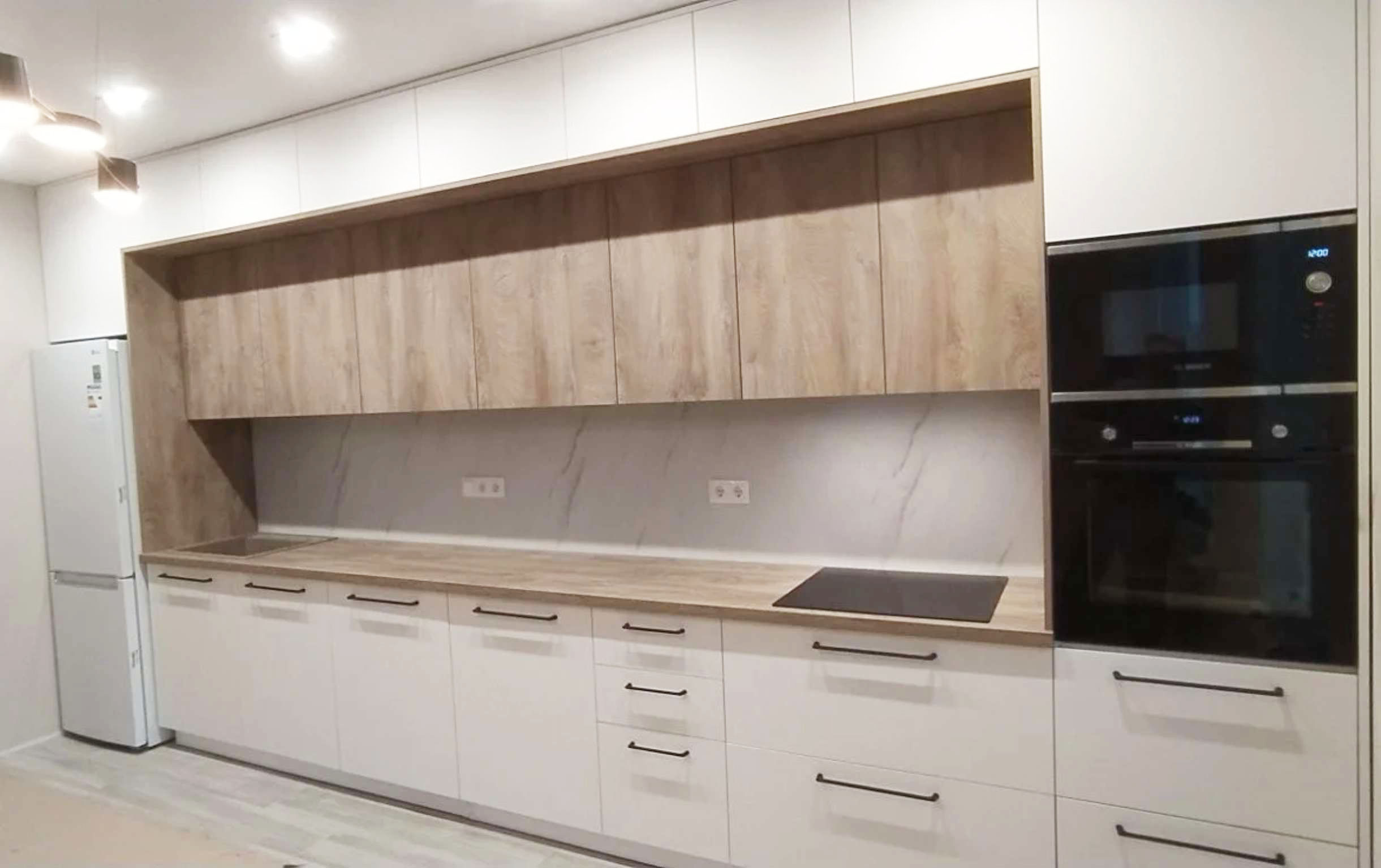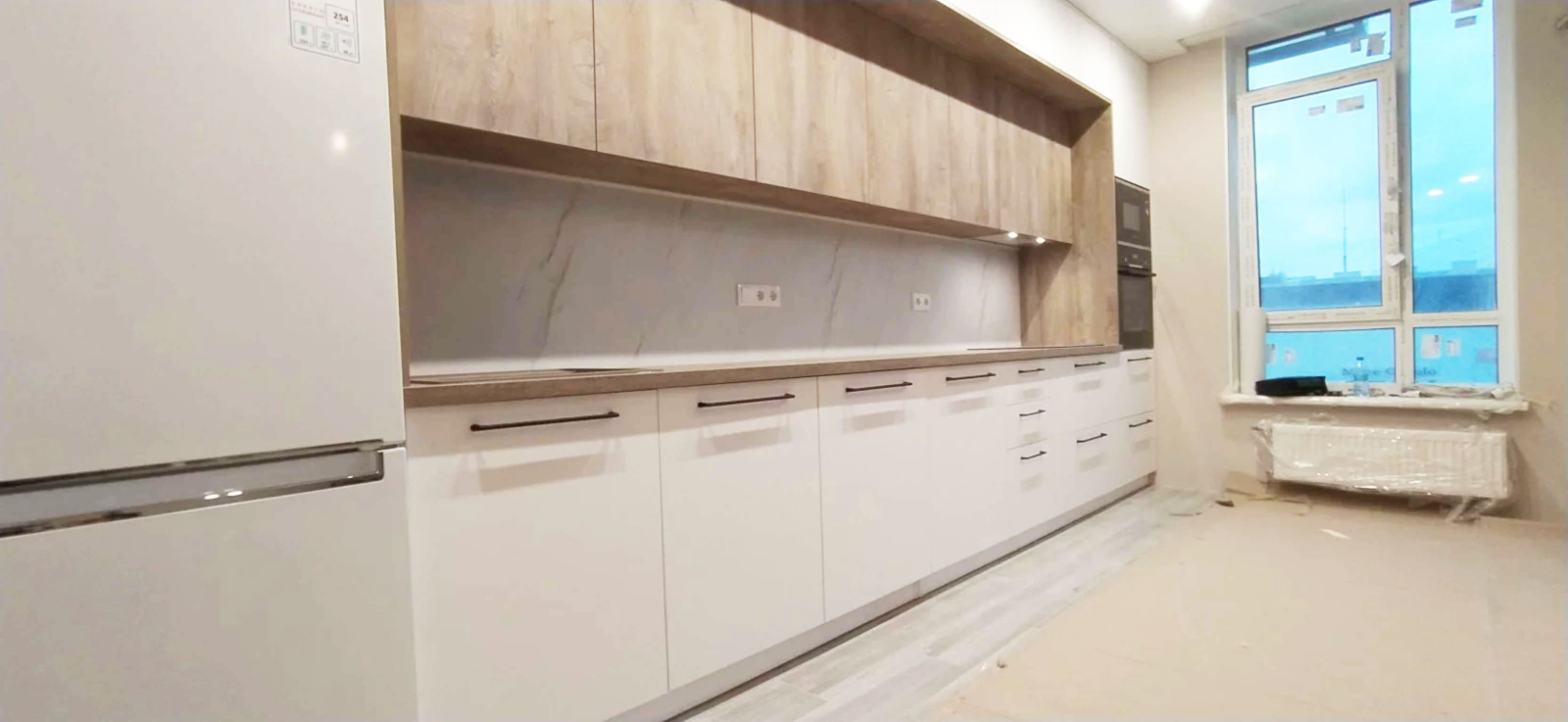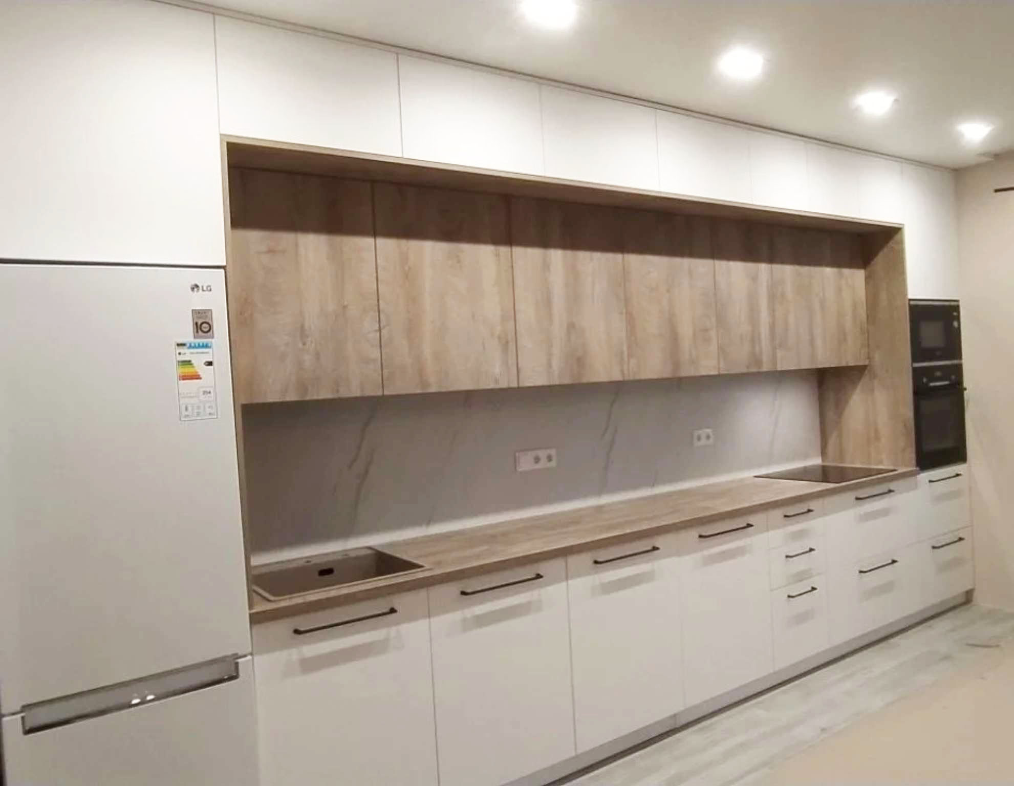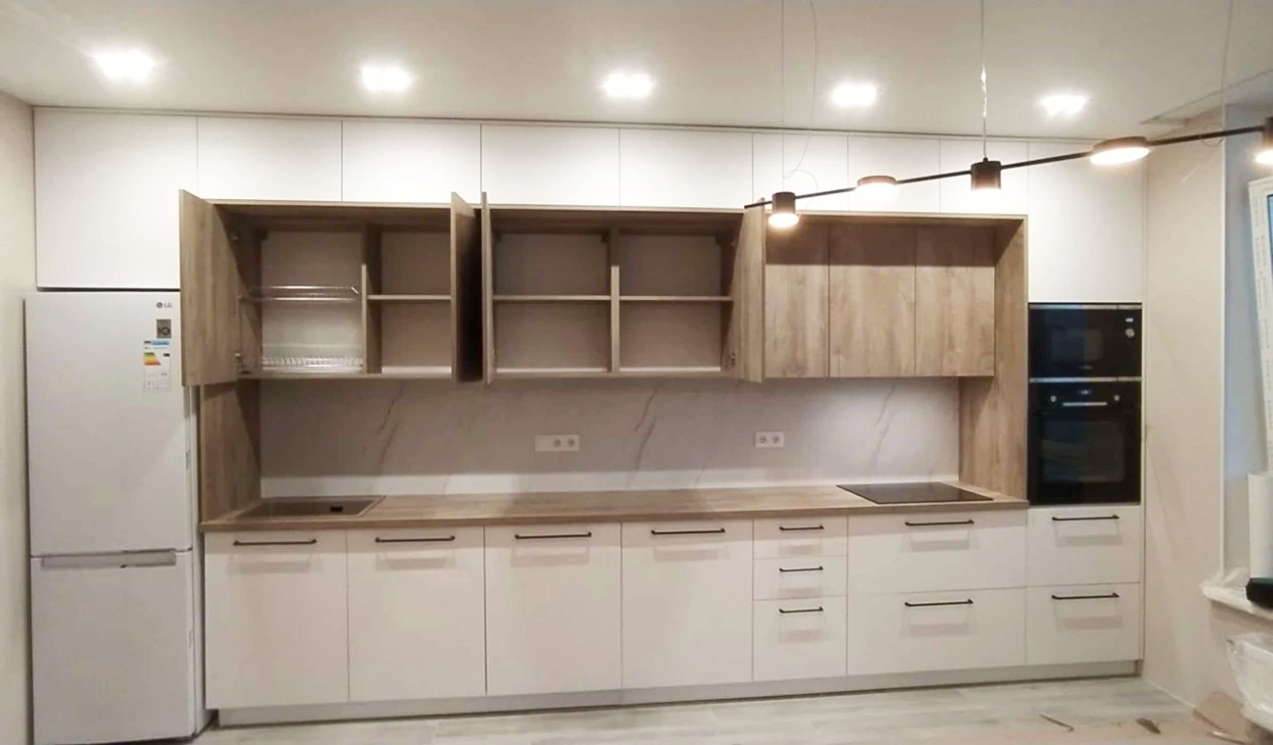 Больщая светлая кухня, с просторной рабочей зоной