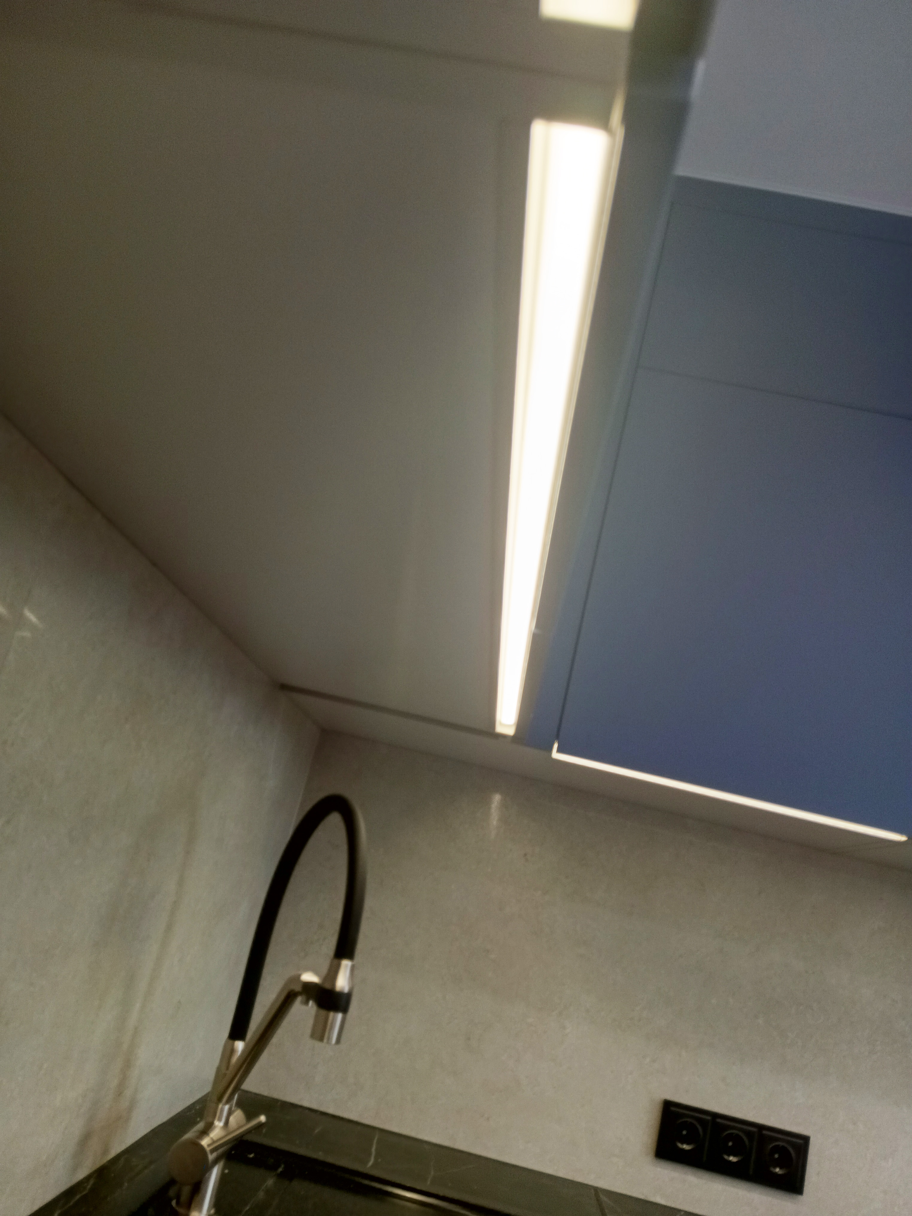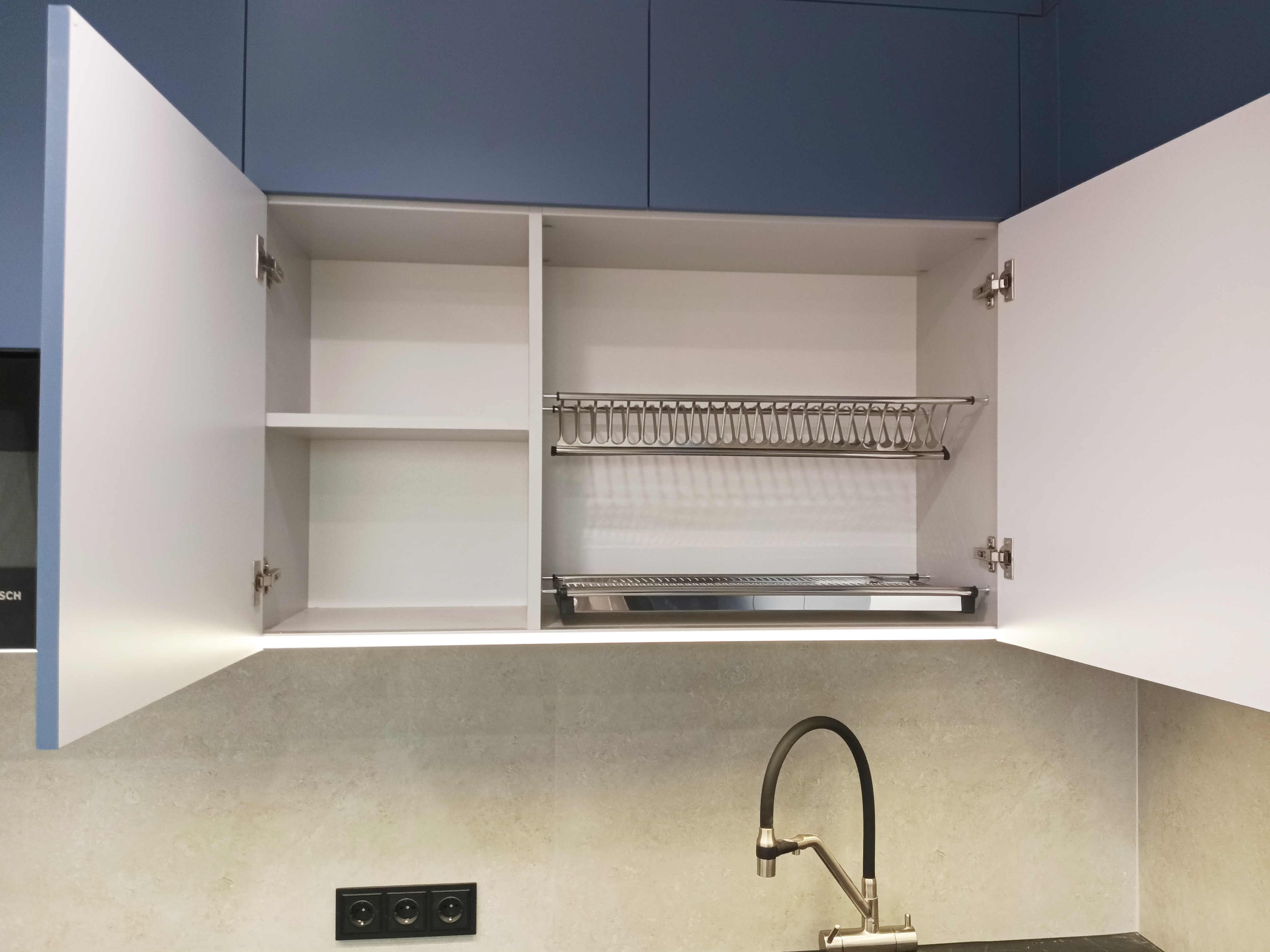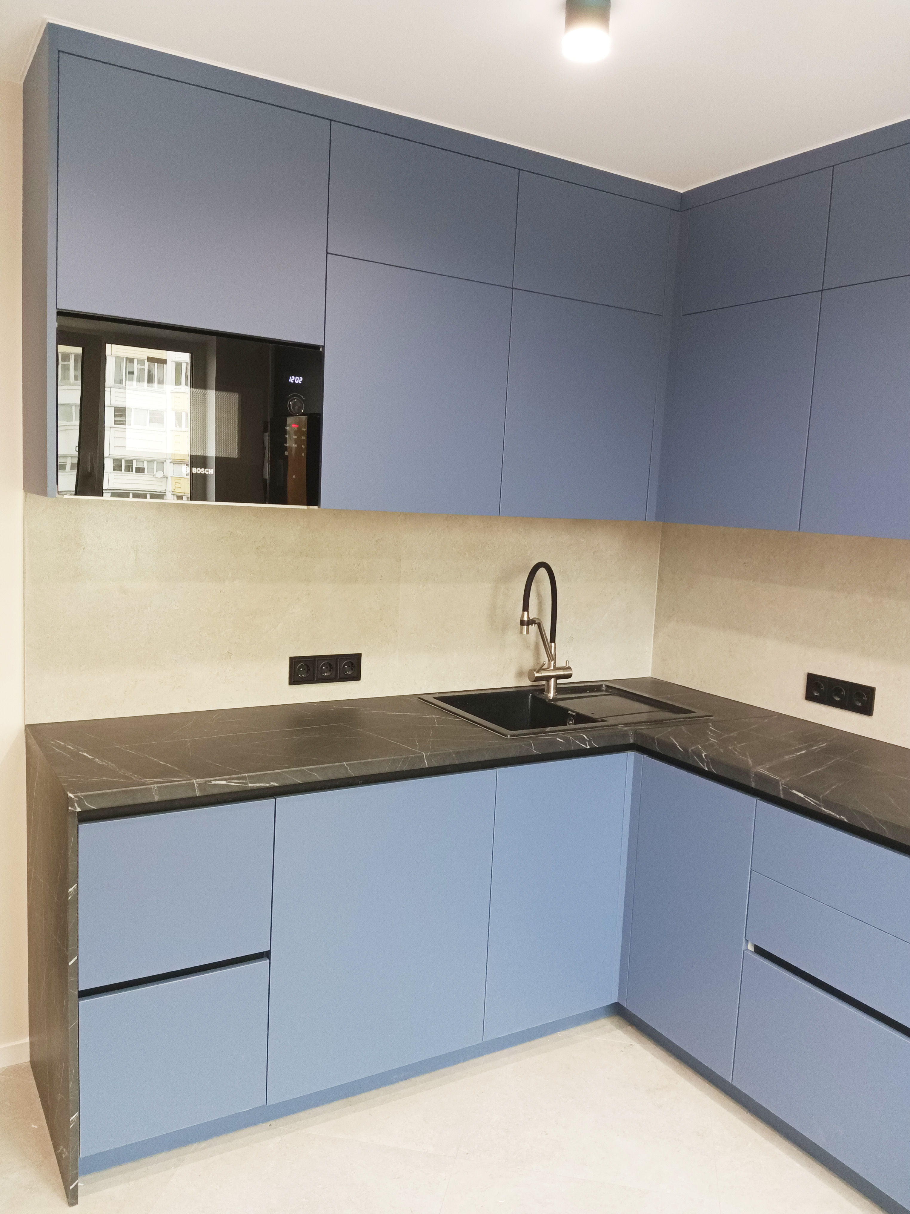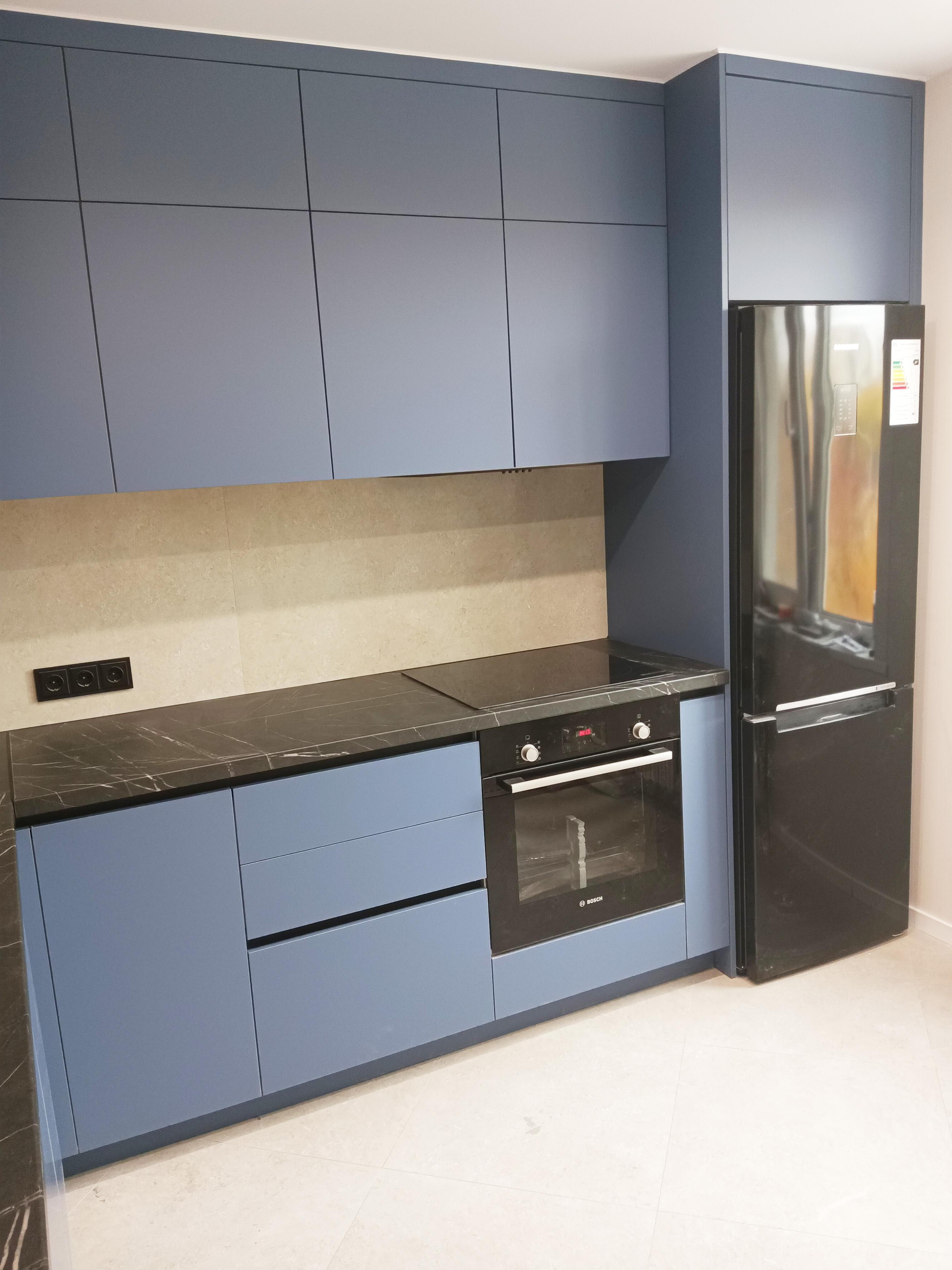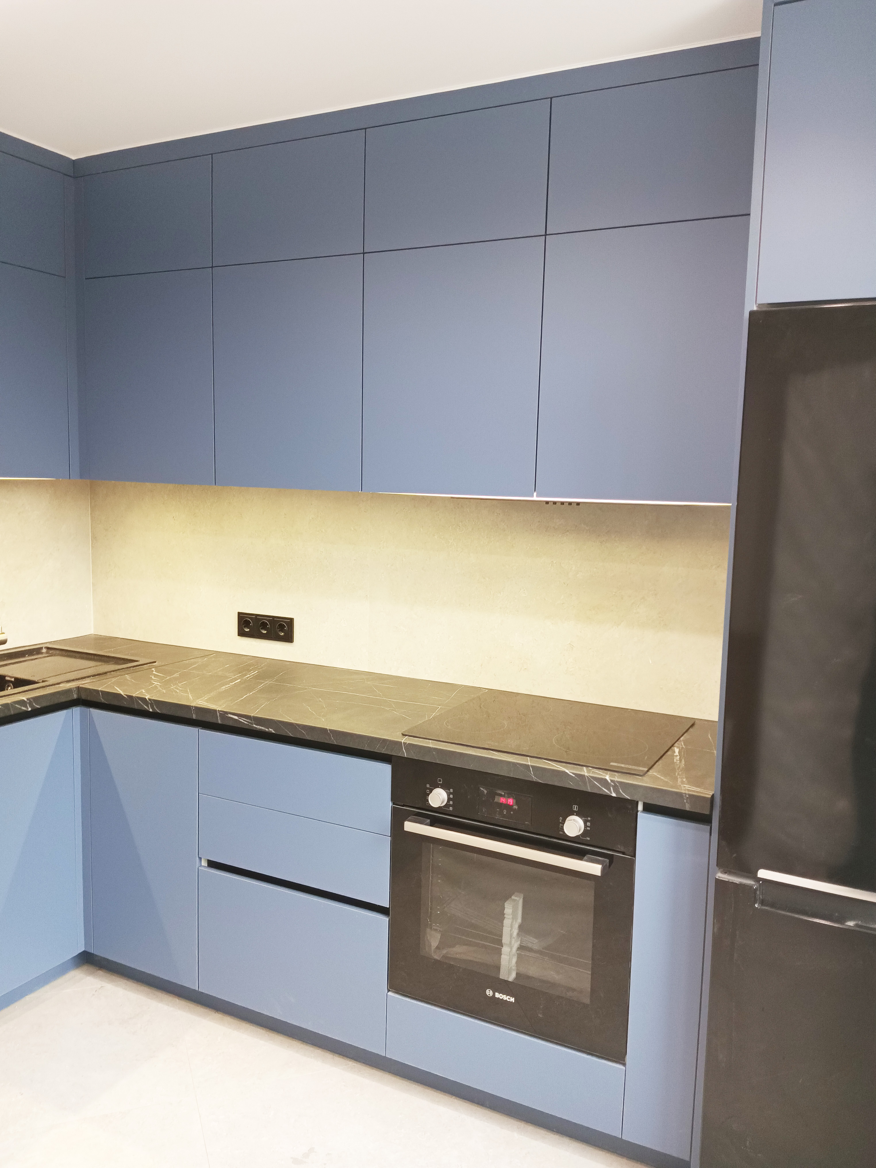 Элегантная кухня в синих тонах с акриловыми фасадами