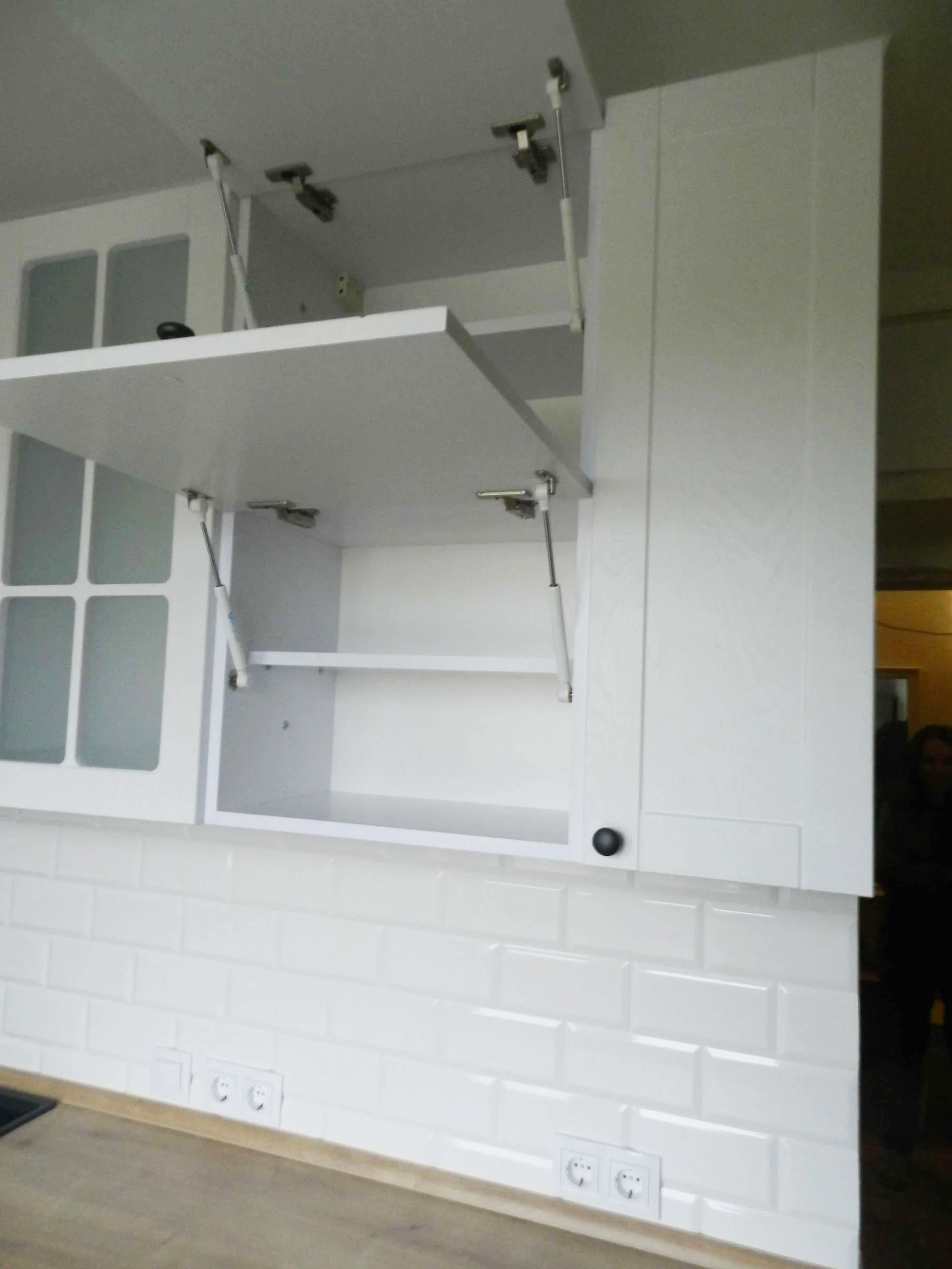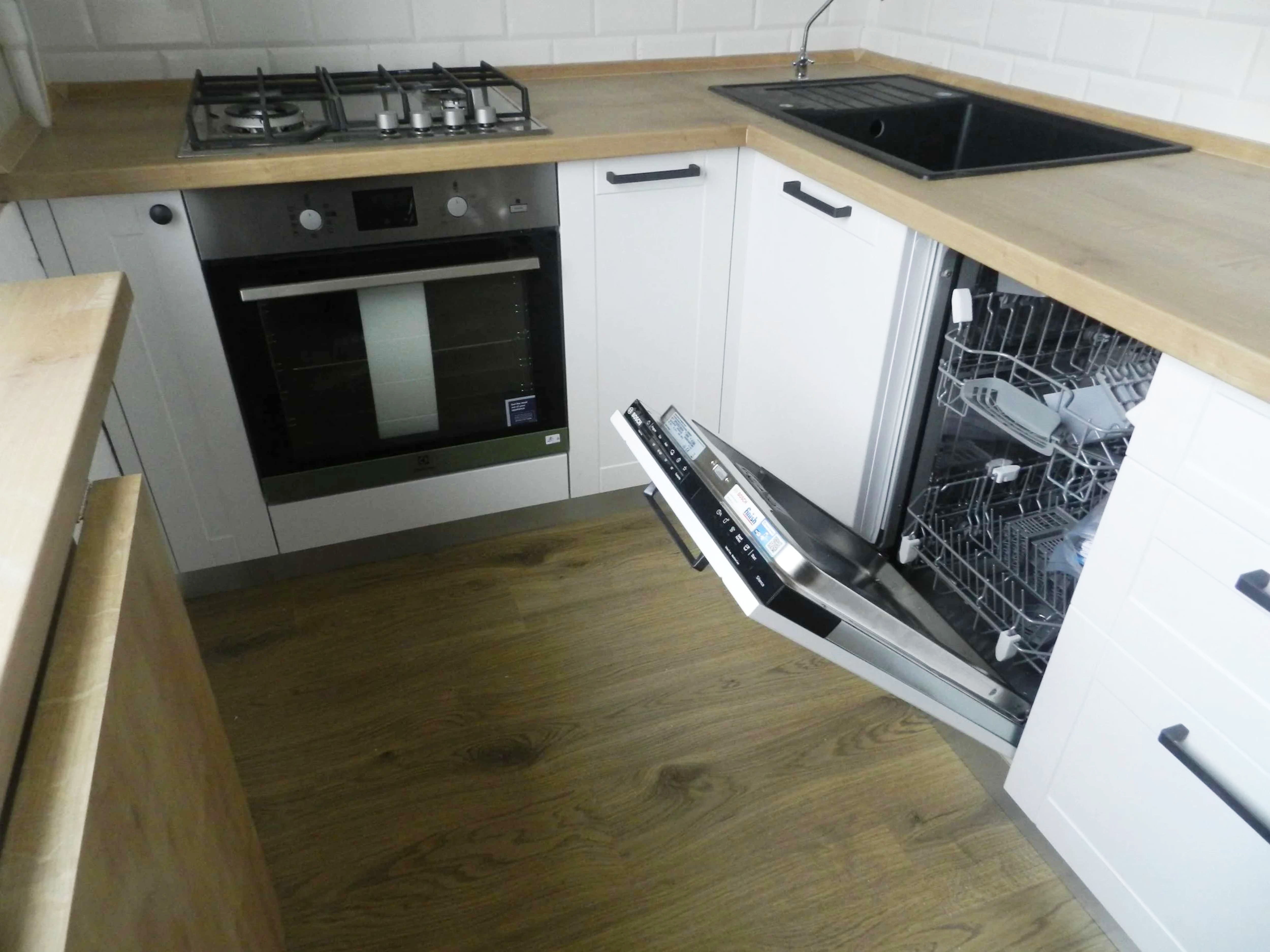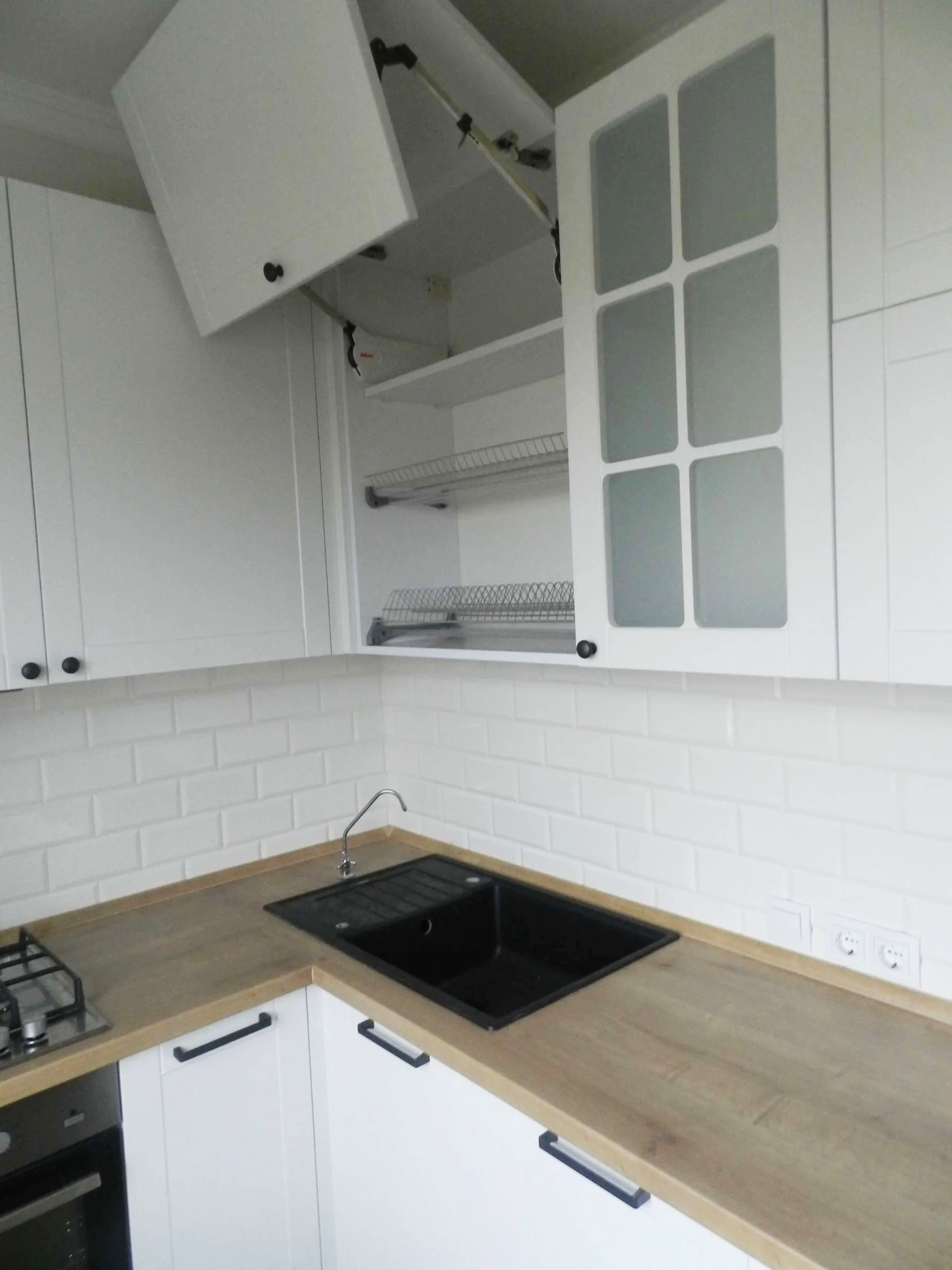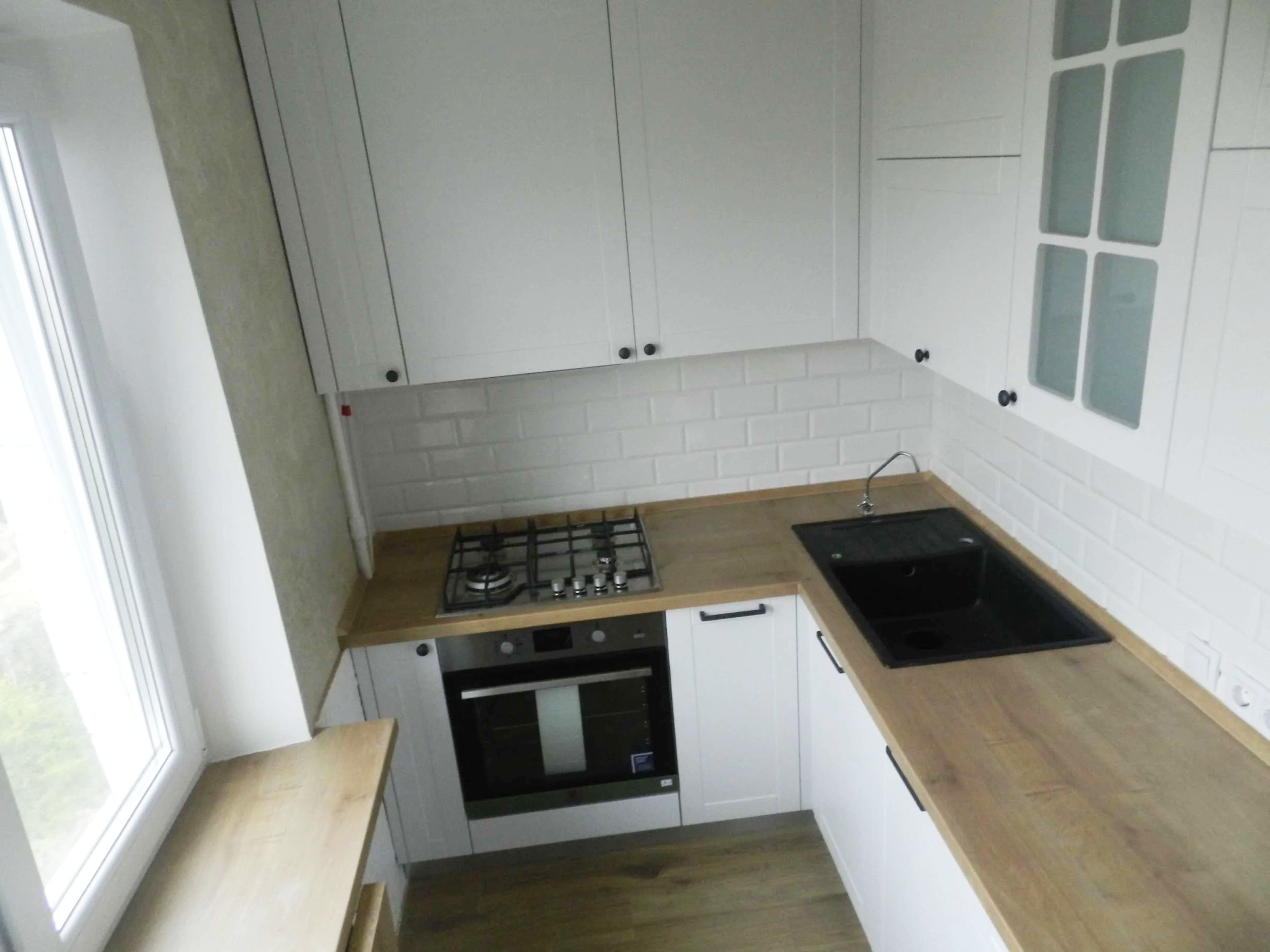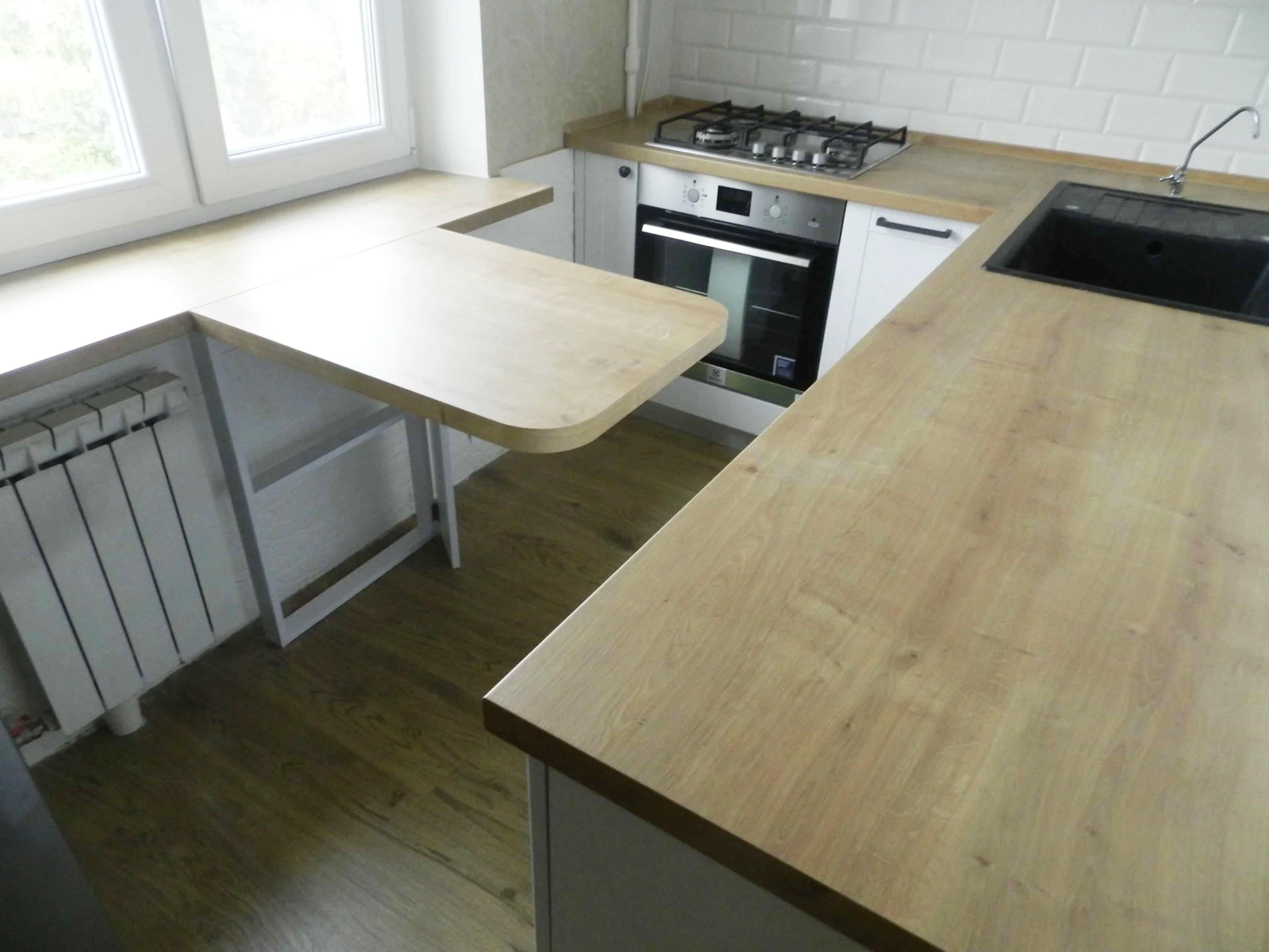 П - образная светлая кухня, со столешницей под дерево