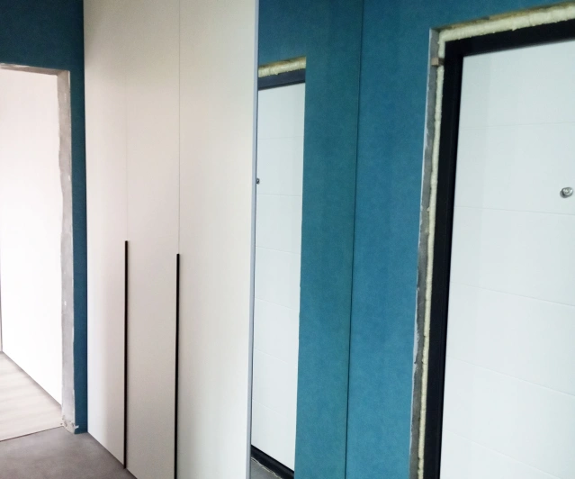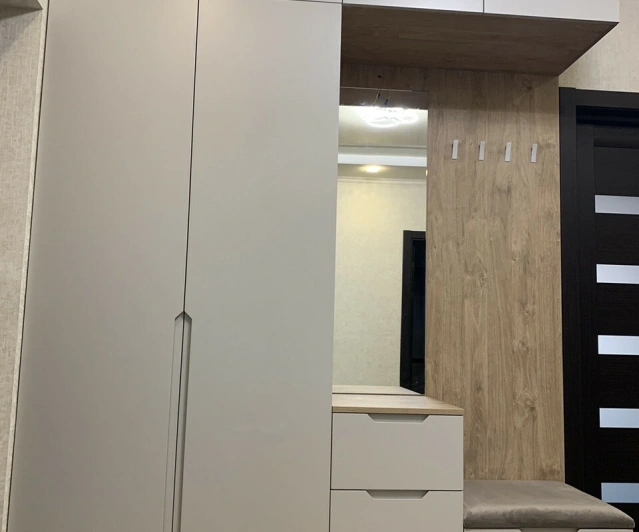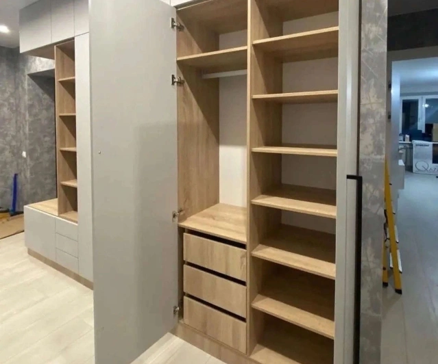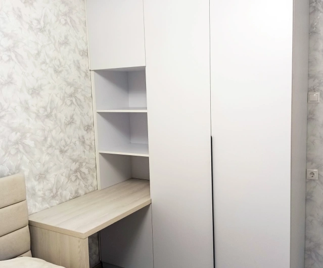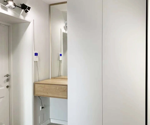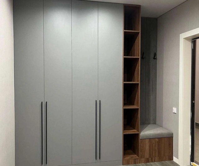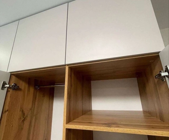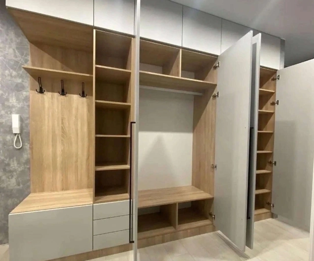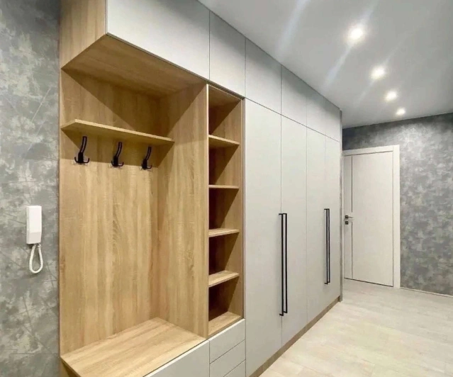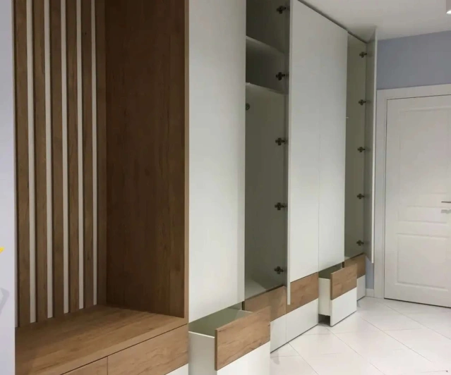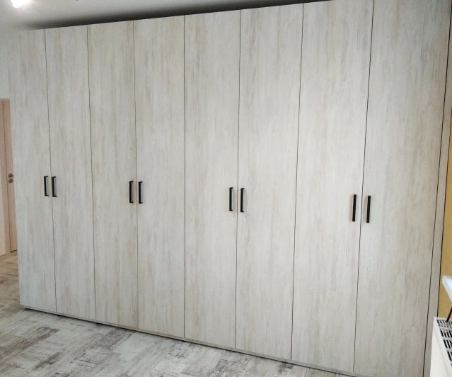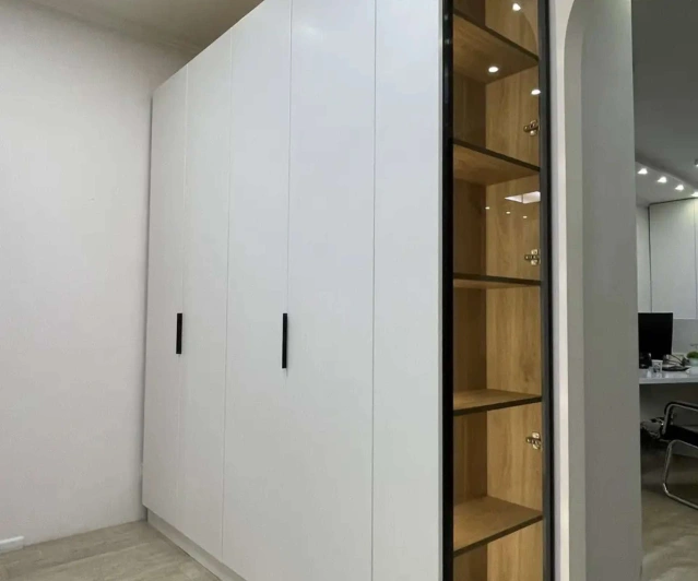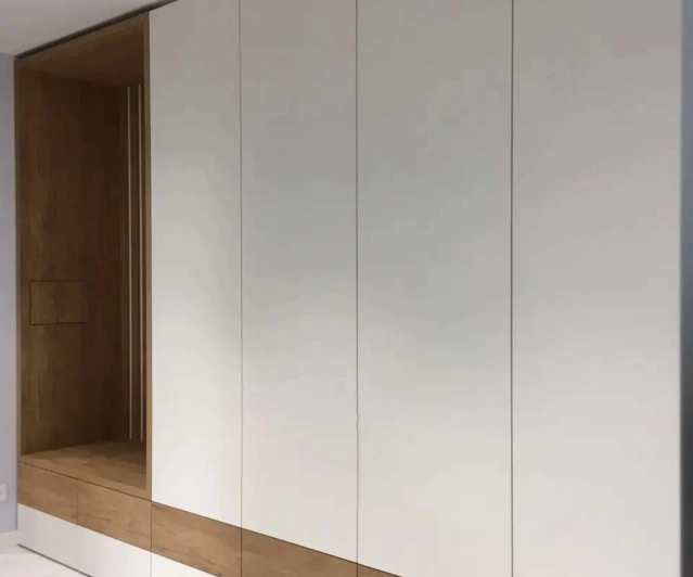 Белый шкаф во всю стену с деревянными панелями