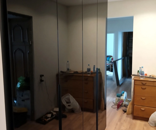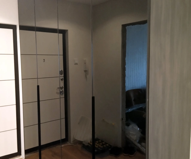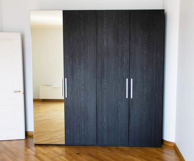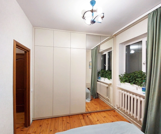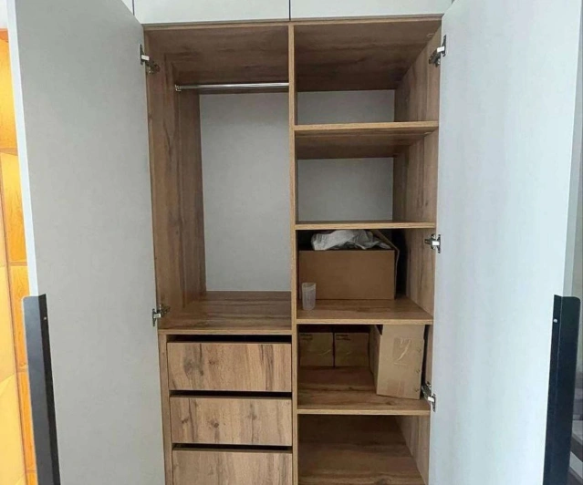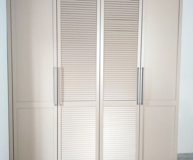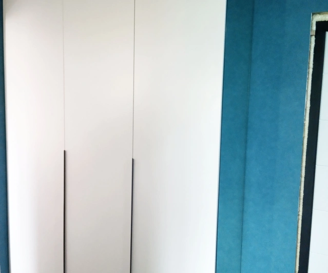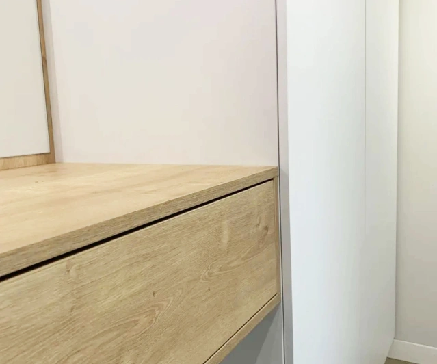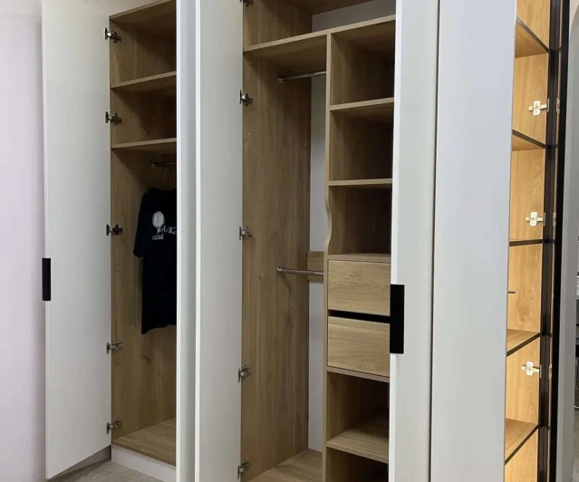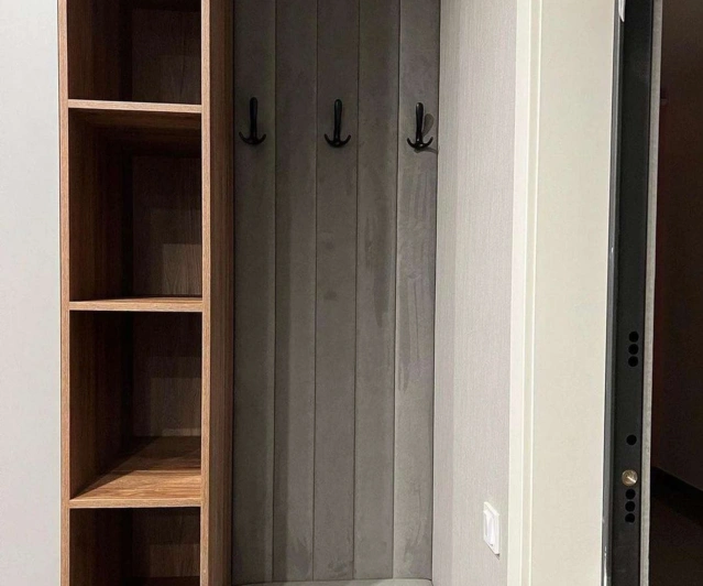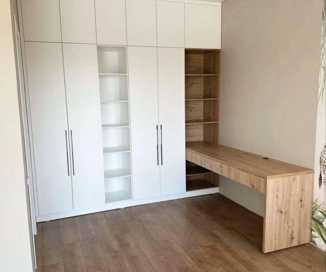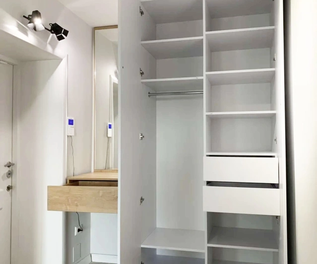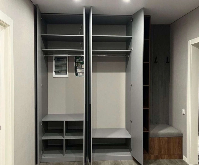 Белый шкаф во всю стену с деревянными панелями