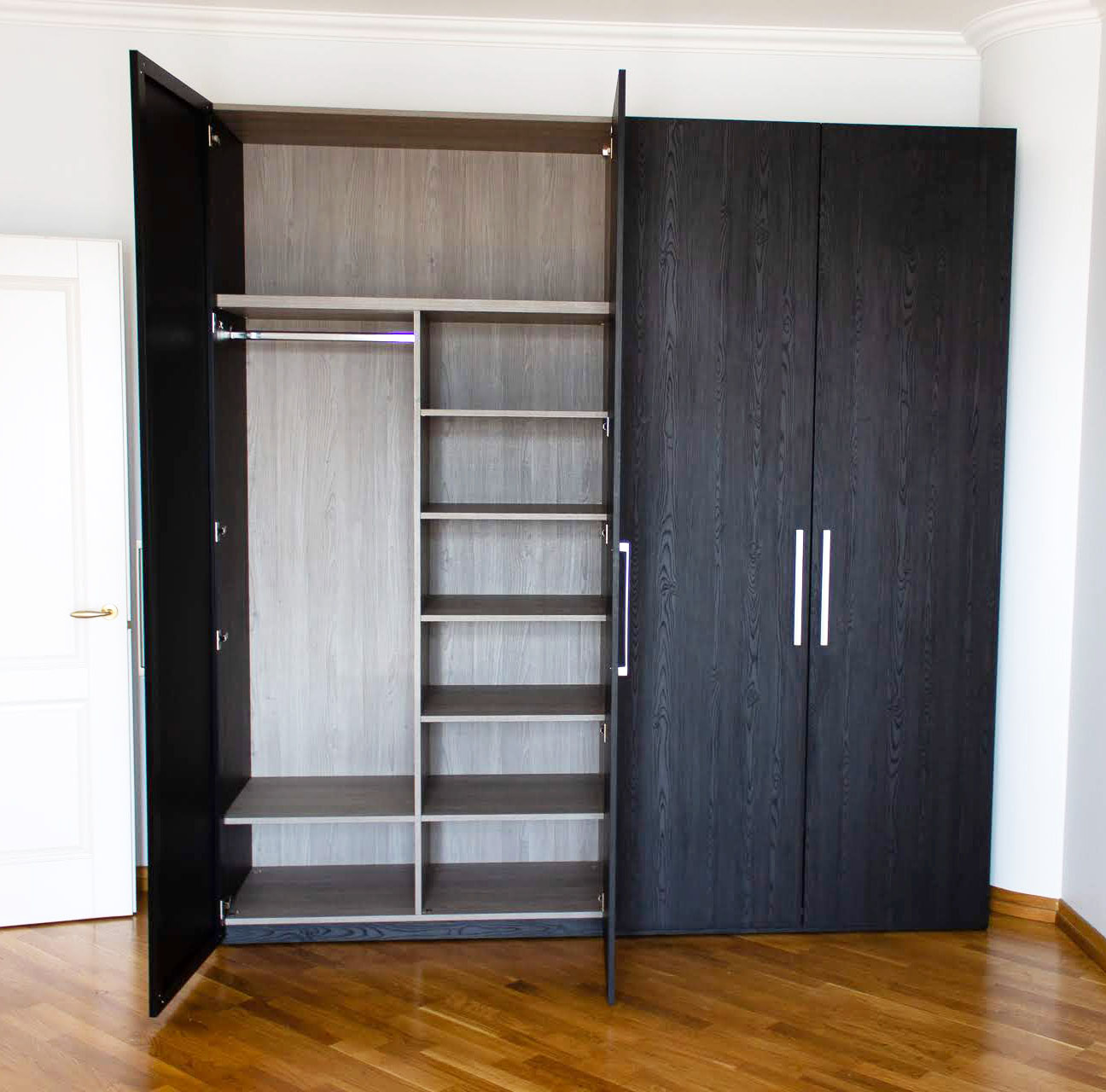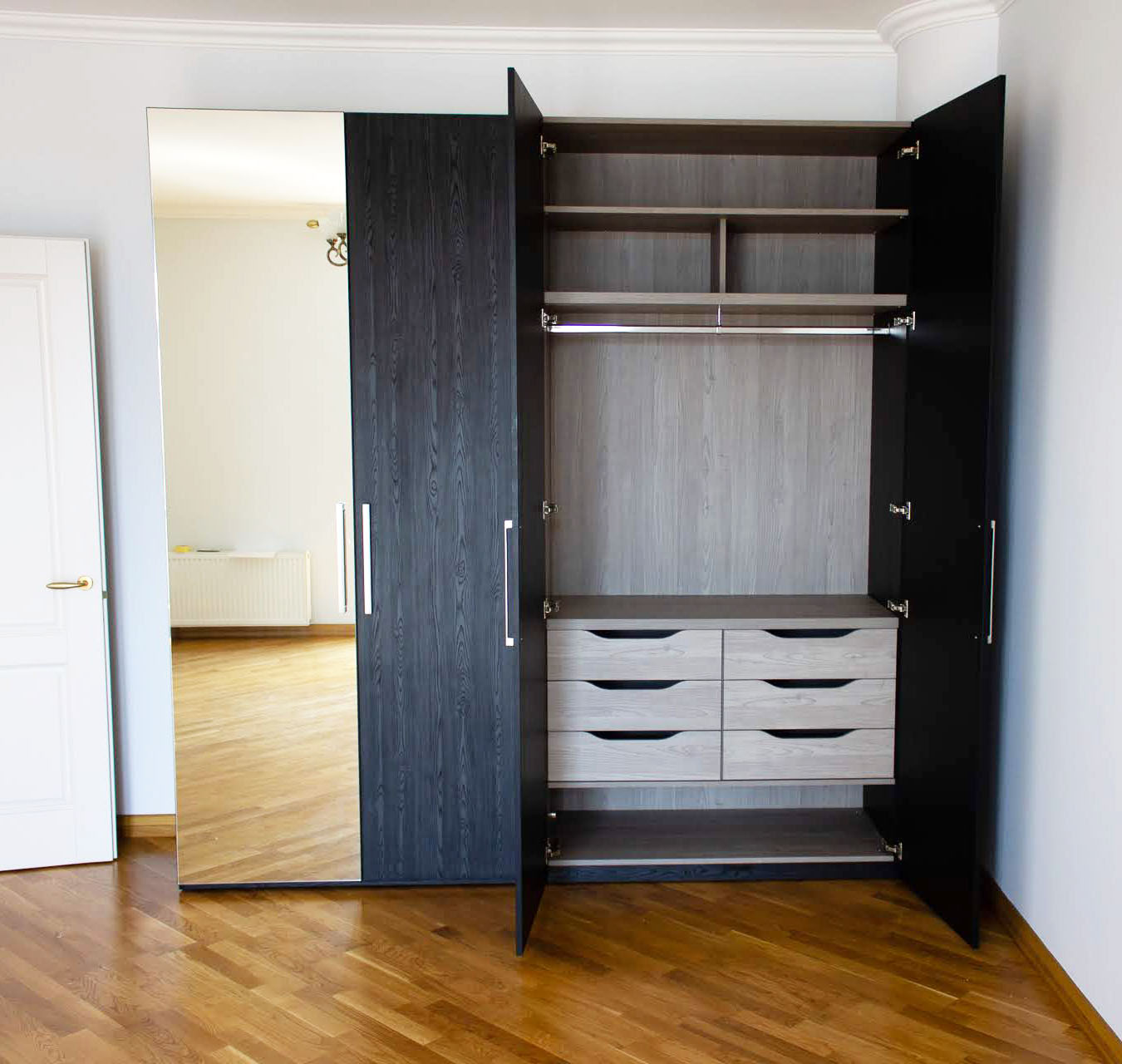 Черный распашной шкаф с зеркалом и текстурой дерева