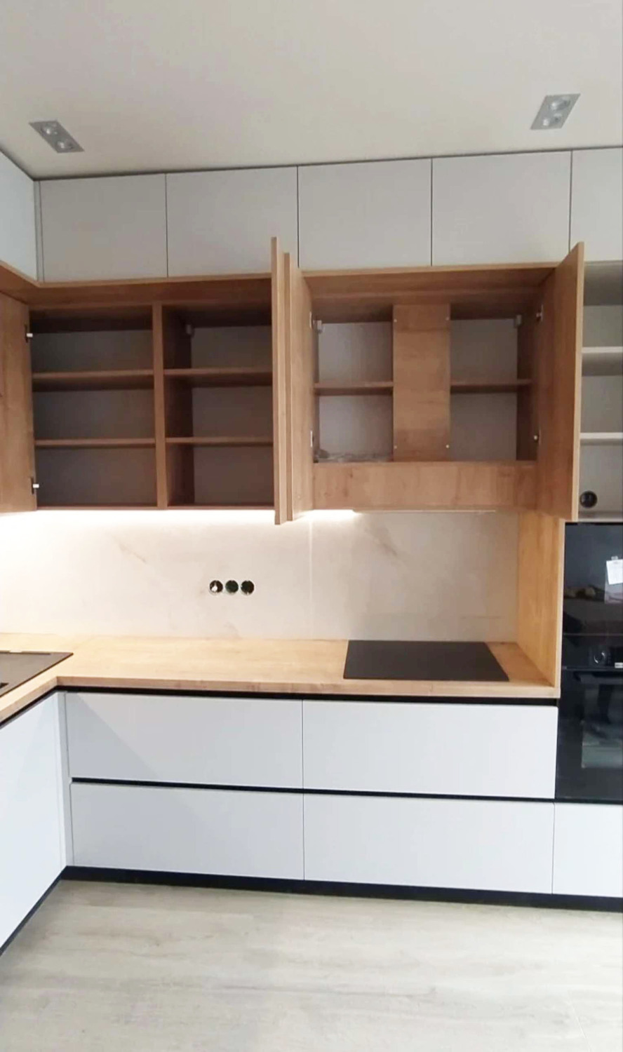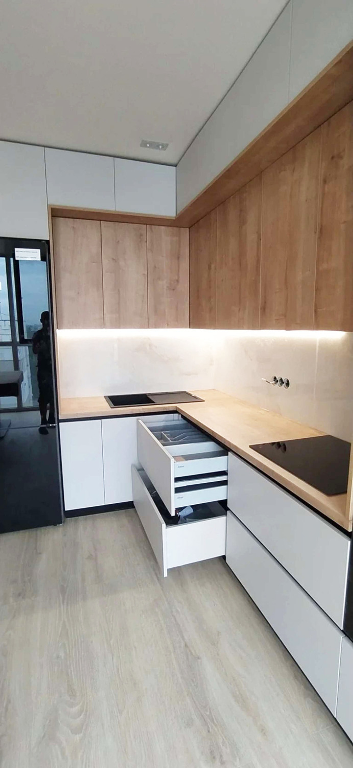 | Фурнитура | Фурнитура Blum. Петли с доводчиками, врезные профиля Gola, ящики на системе ANTARA, подсветка рабочей зоны. |