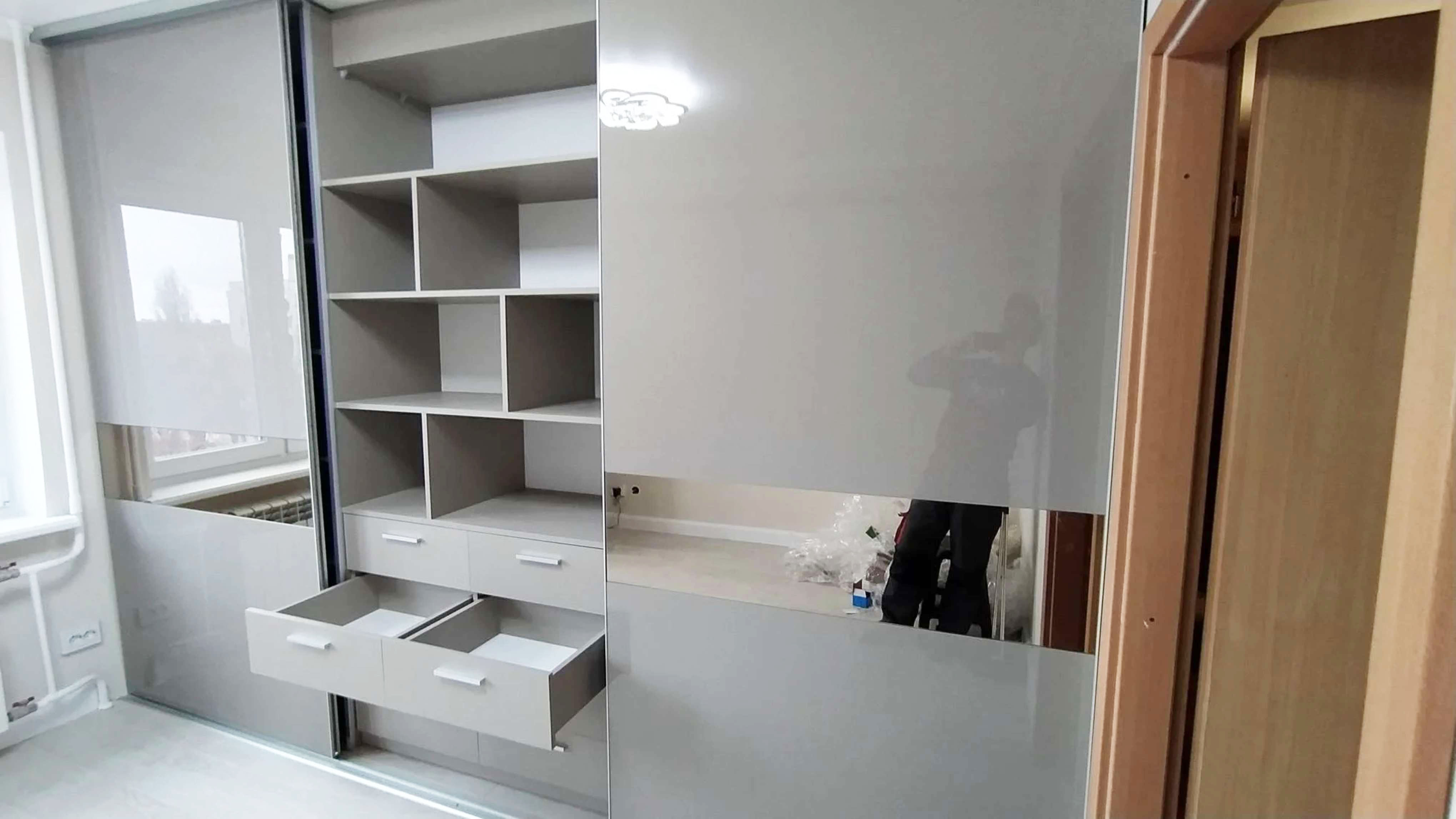 Серый шкаф купе во всю стену