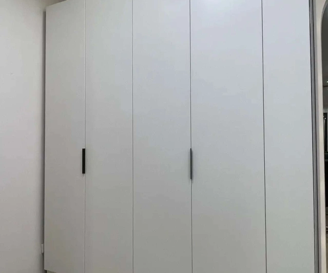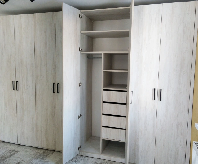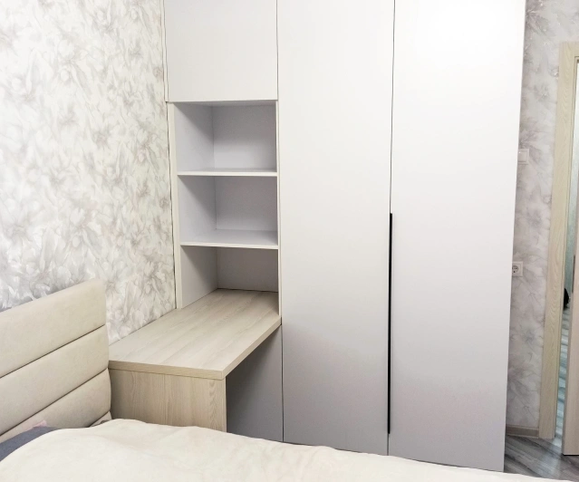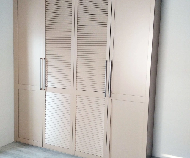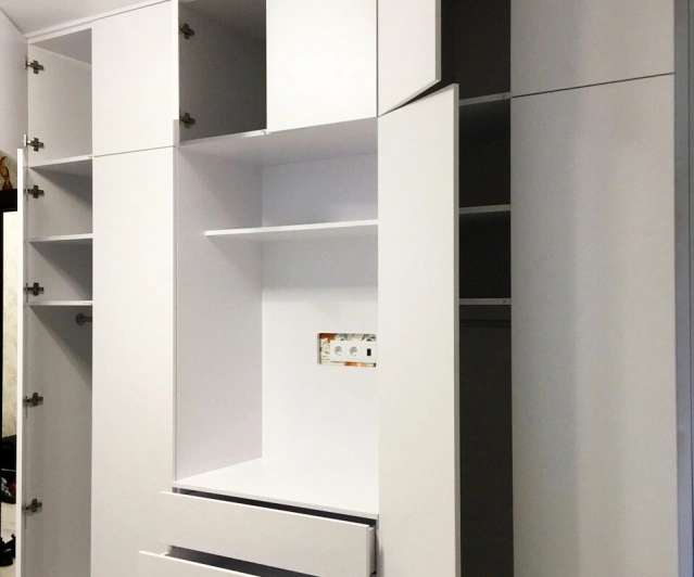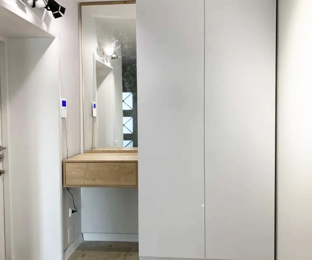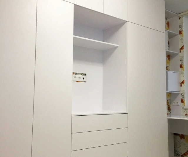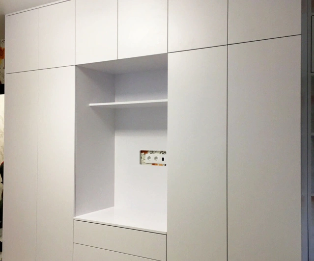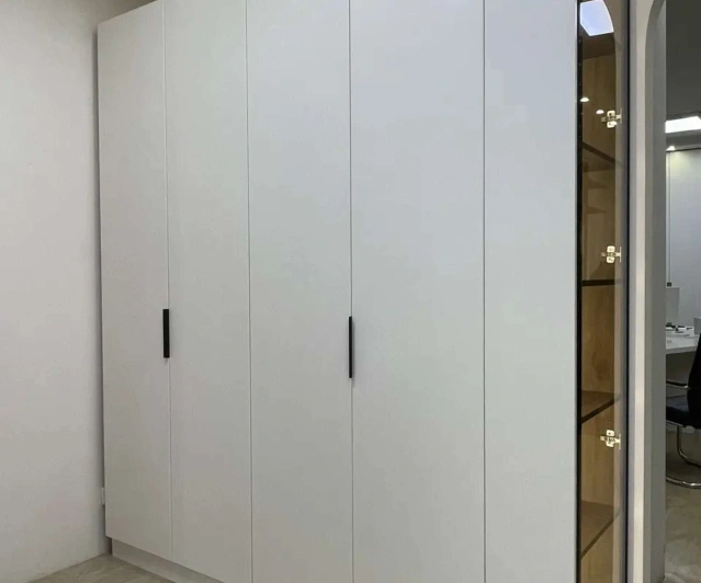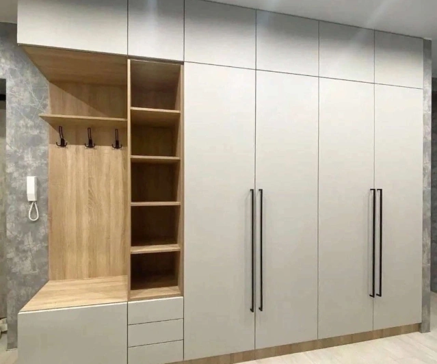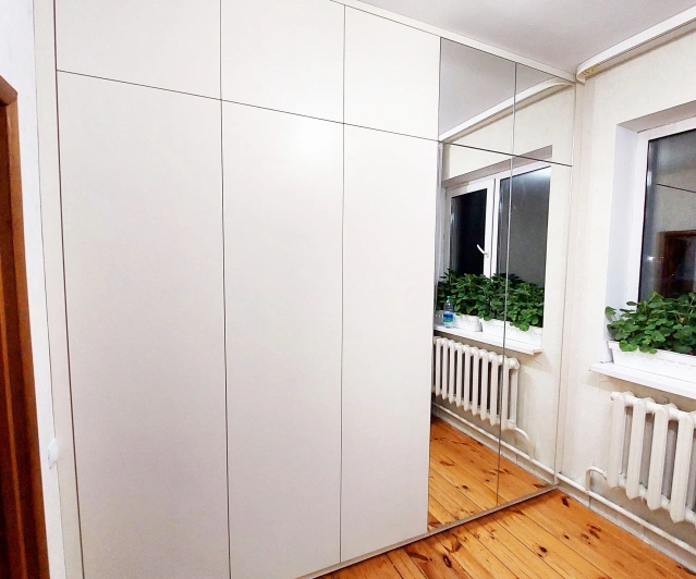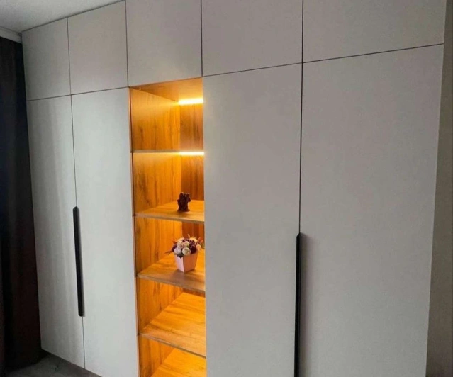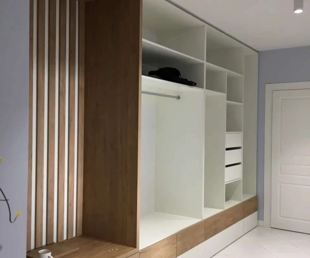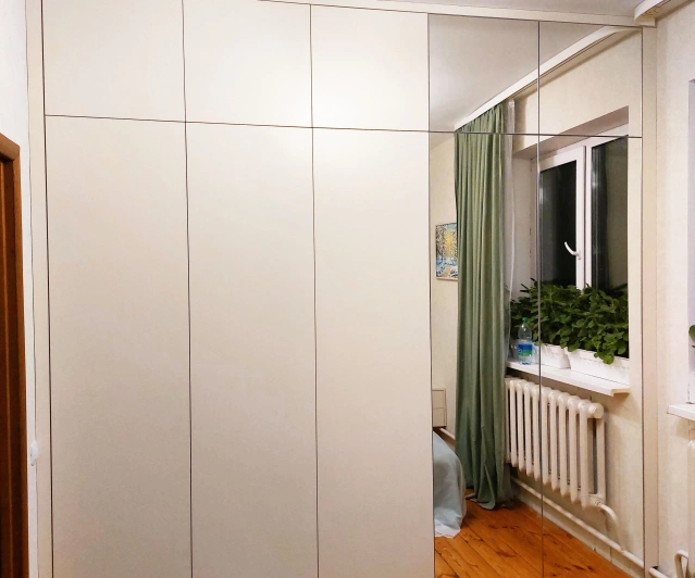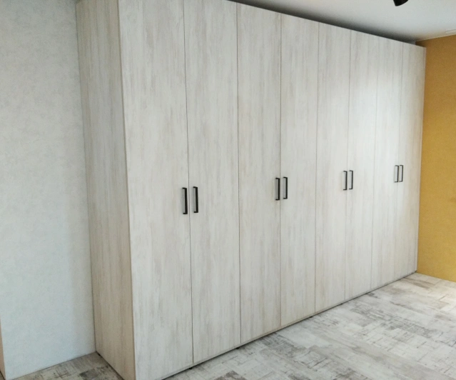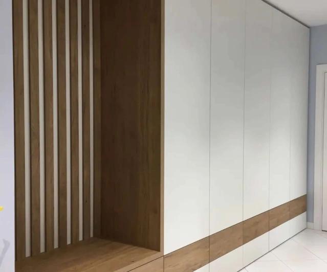 Белый шкаф во всю стену с деревянными панелями