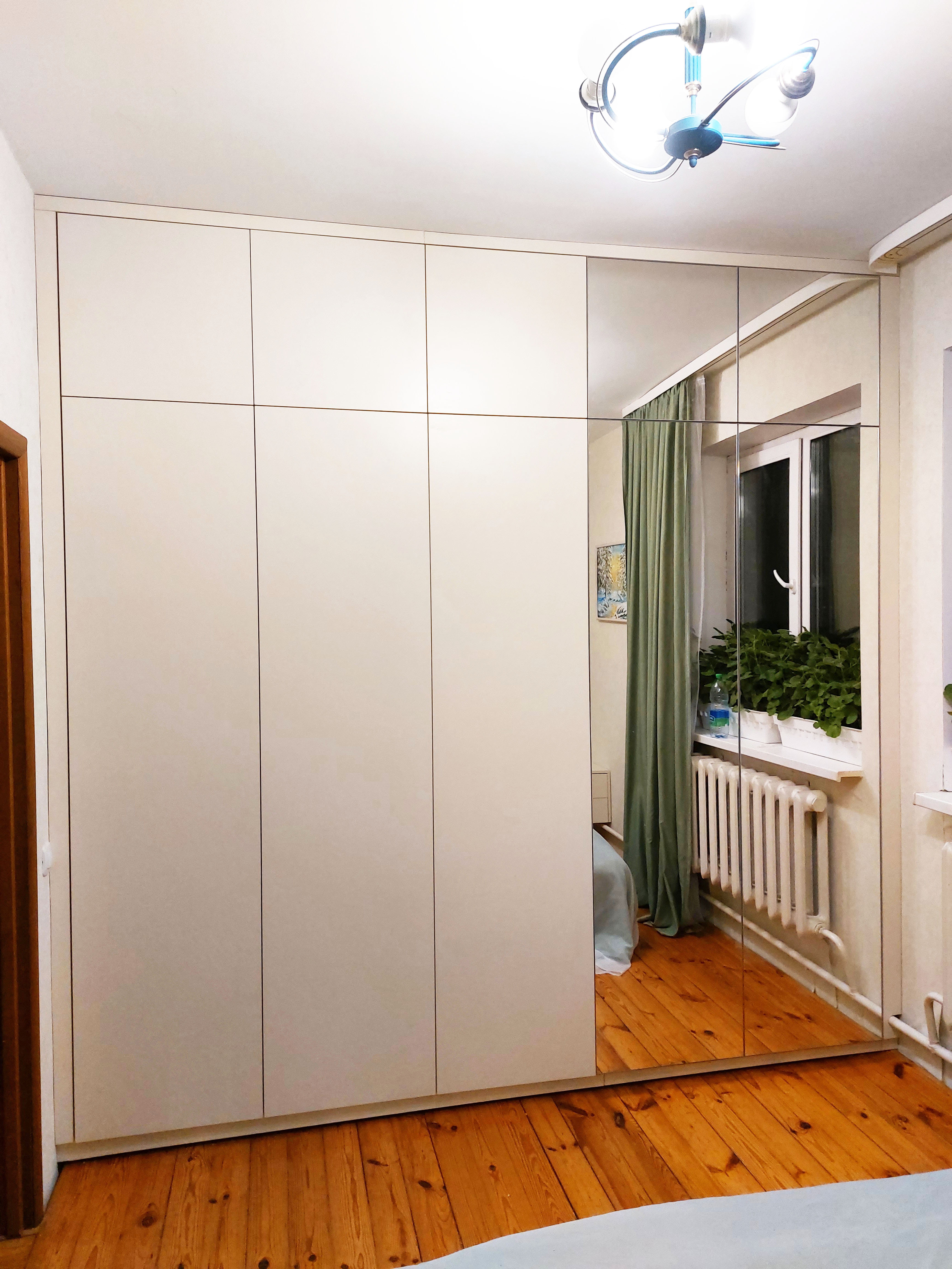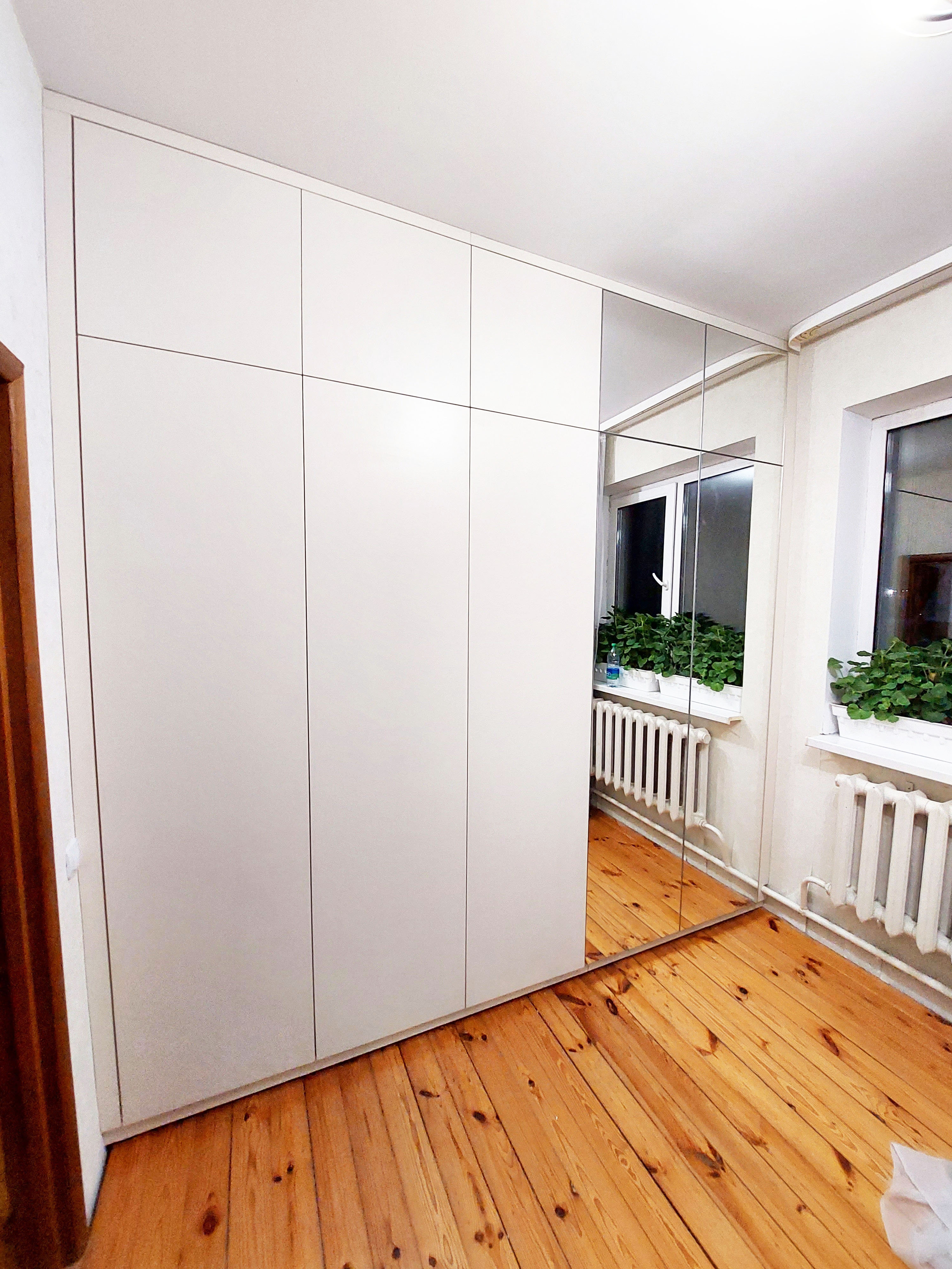 Белый распашной шкаф без ручек с зеркалом