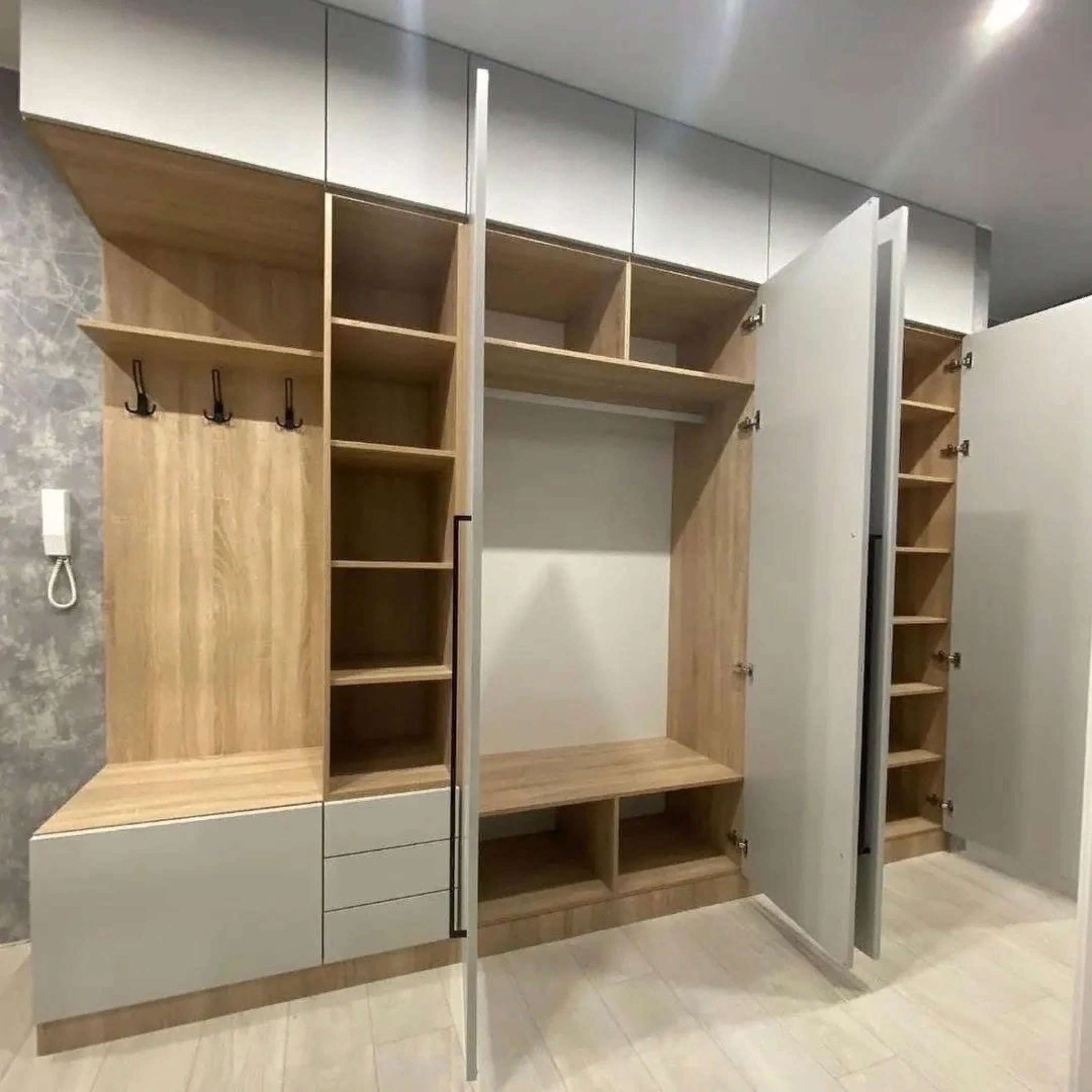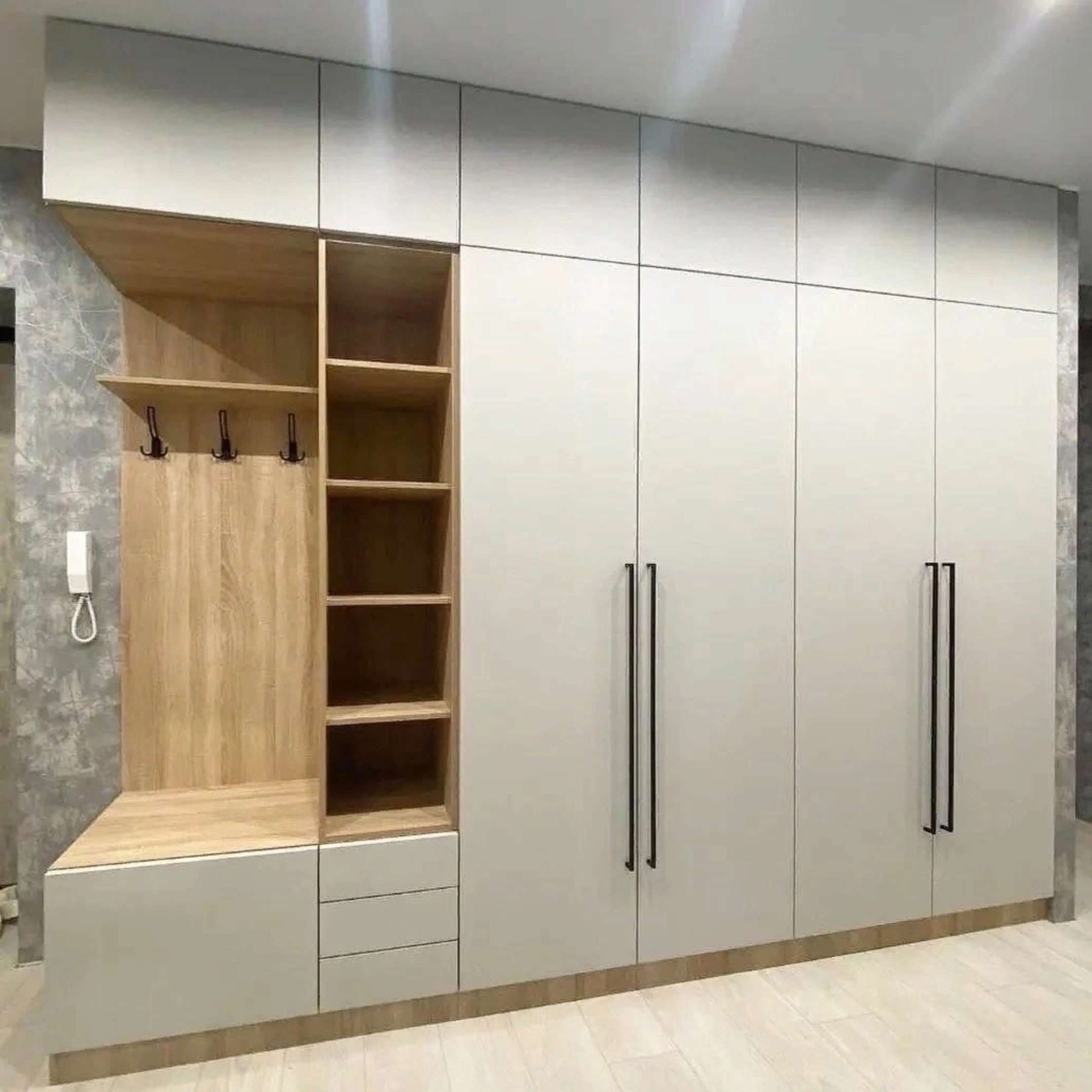Большой белый шкаф с крючками под одежду
