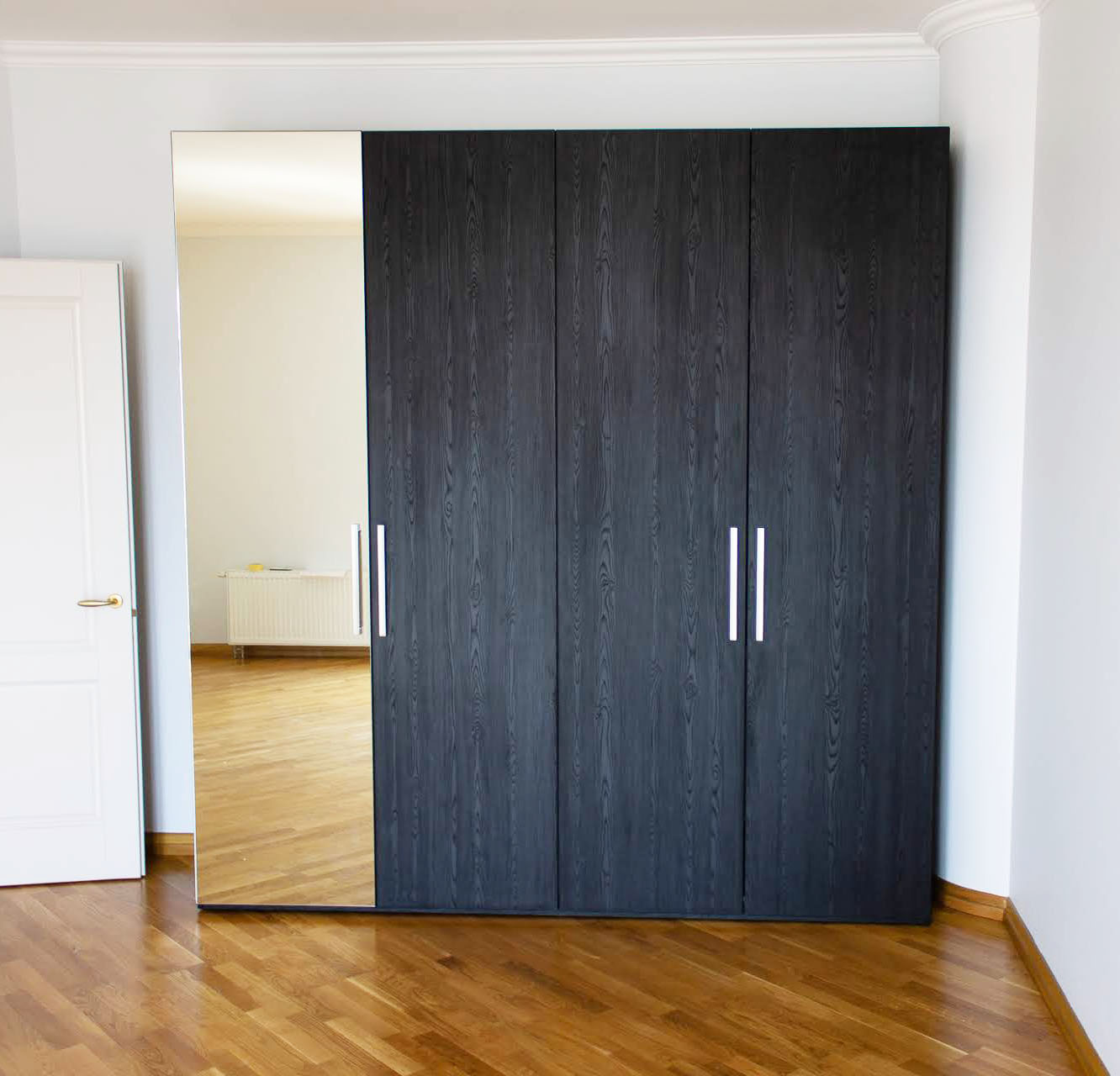 Черный распашной шкаф с зеркалом и текстурой дерева